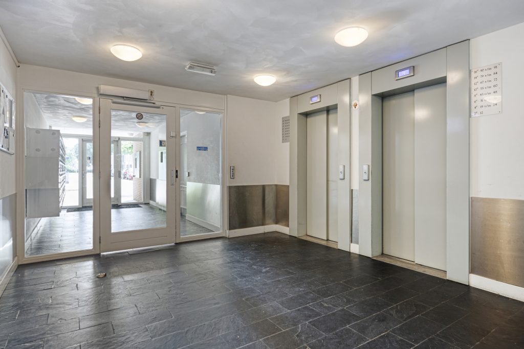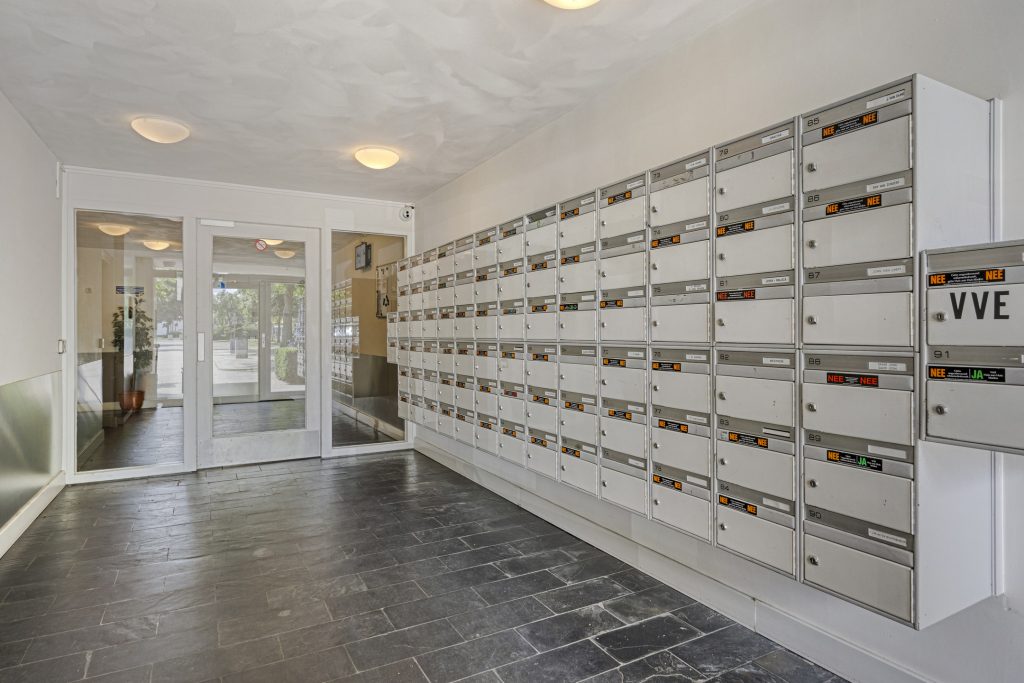 In de centrale entree bevinden zich de brievenbussen, de toegangsdeur tot de gemeenschappelijke fietsenberging, de liften en het trappenhuis.