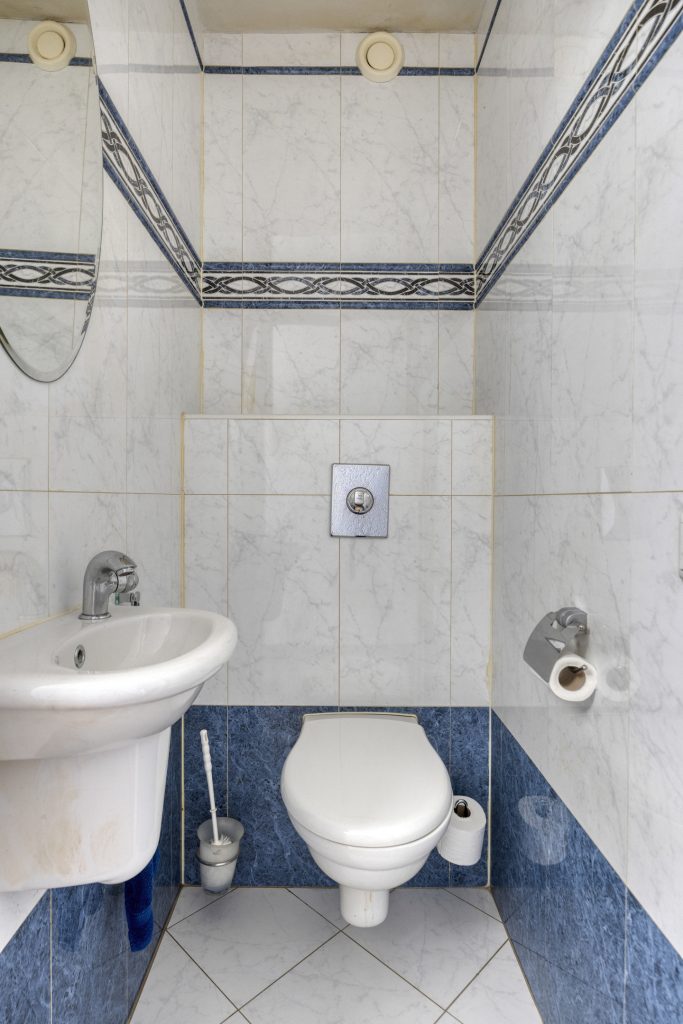 Geheel betegelde toiletruimte met wandcloset en fonteintje.