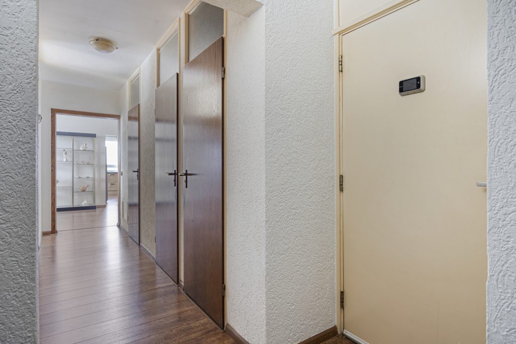 Long hallway with beautiful Quickstep laminate flooring.