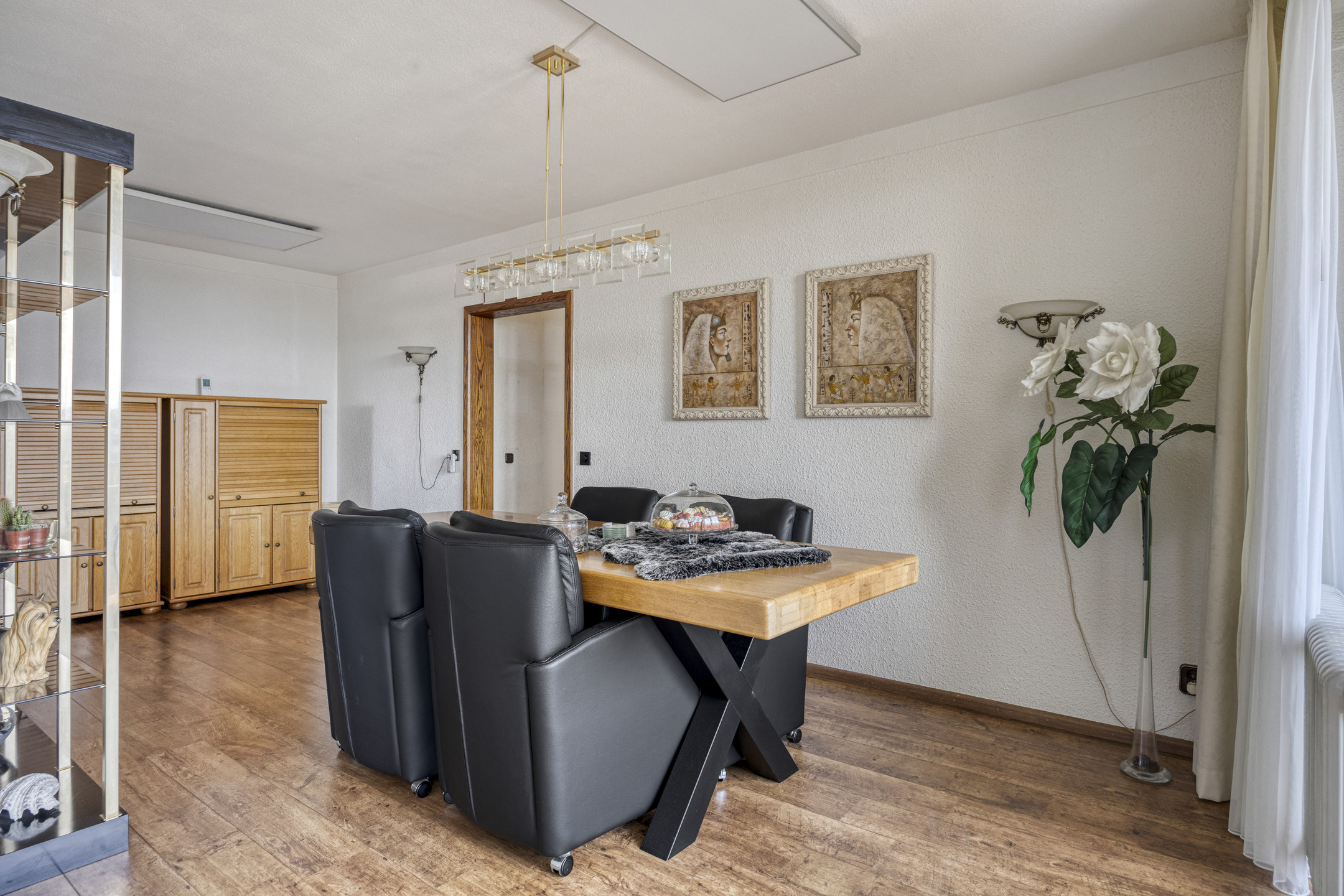 Royale en sfeervolle woon-/eetkamer met Quickstep laminaatvloer en airco (welke ook kan verwarmen). Er is daar ook glasvezelaansluiting.