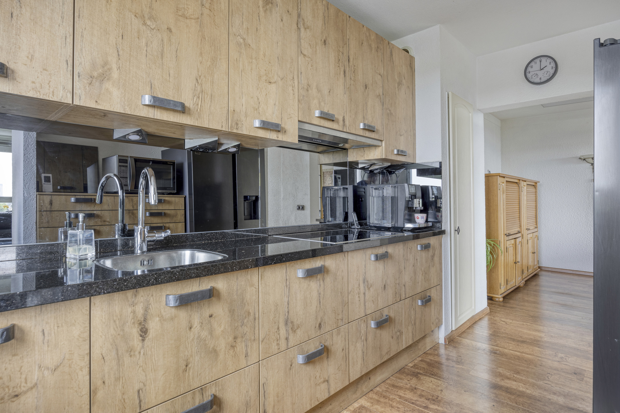 The kitchen (built in 2019) is open on both sides to the living/dining room and is equipped with a modern corner unit. The kitchen features a granite countertop with sink, a 4-burner induction cooktop (Miele), extractor hood, separate fridge/freezer, separate microwave, dishwasher (Miele), and various cupboards and drawers.