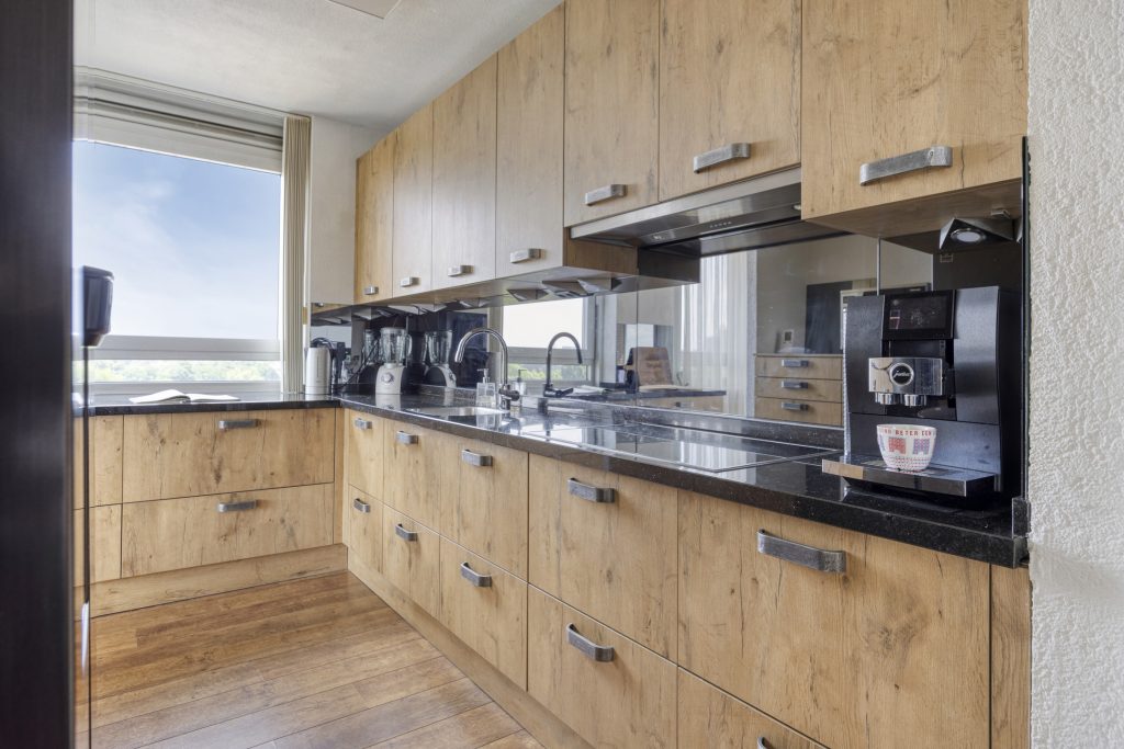 De keukeninrichting is voorzien van een granieten aanrechtblad met spoelbak, 4-pits inductie kookplateau (Miele), afzuigscherm, losse koel/vriescombinatie, losse magnetron, vaatwasmachine (Miele) en diverse kasten en laden.