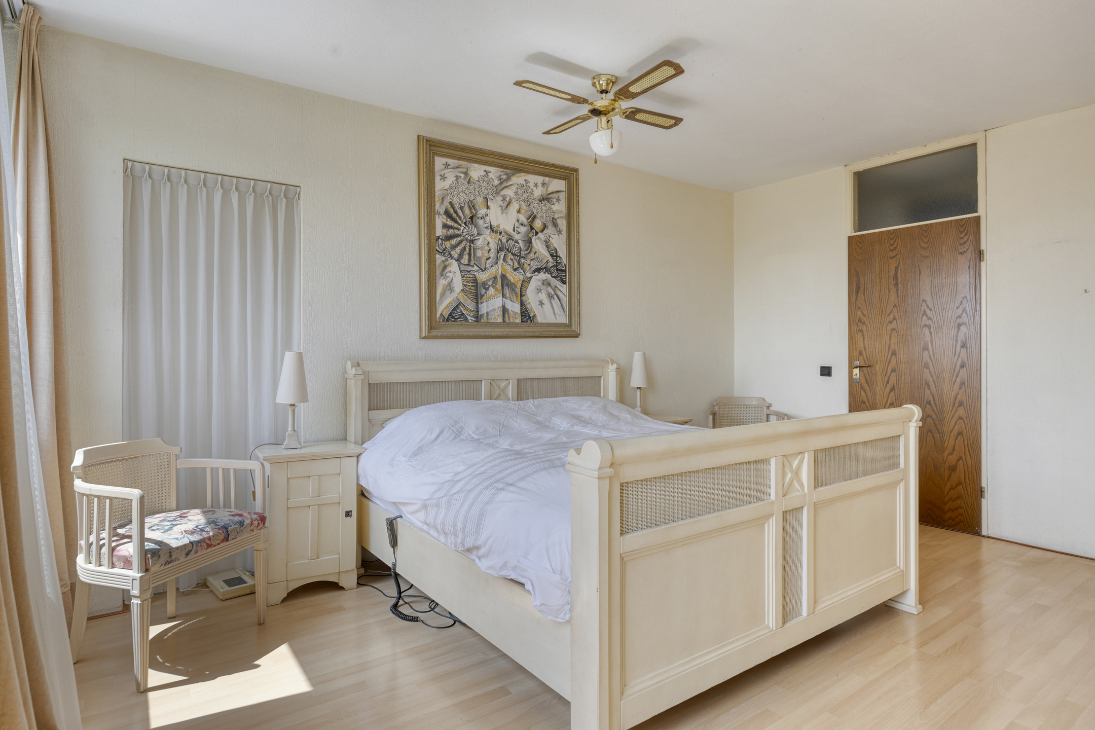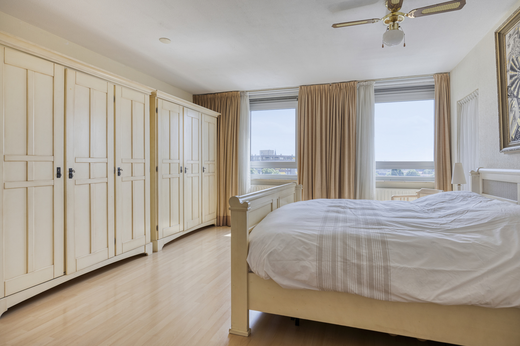 Ruime slaapkamer 1, de grootste kamer, met een laminaatvloer, veel lichtinval door de dubbele raampartij en een losse kastenwand. Zijraam naar het balkon.