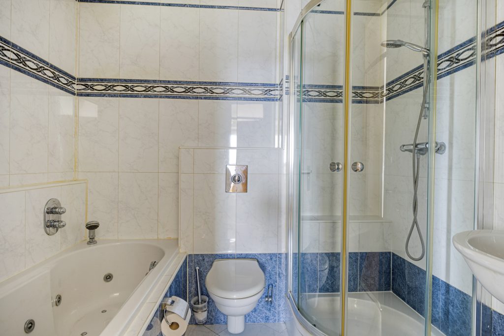 Geheel betegelde badkamer met ligbad, douche, wastafel, toilet en mechanische ventilatie.