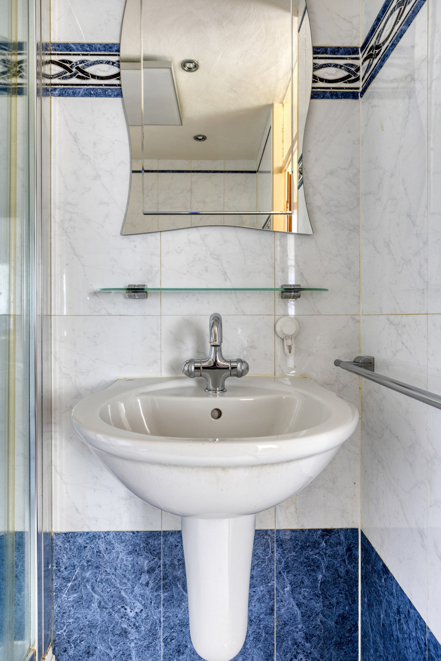 Practical storage space with connections for laundry appliances (formerly a shower room).