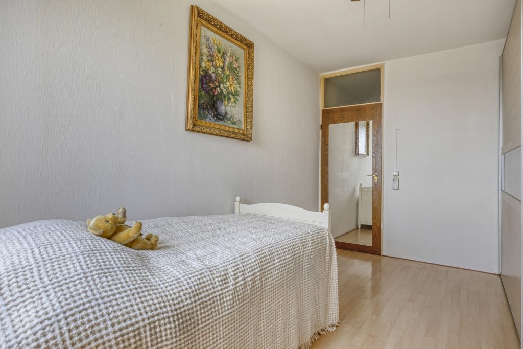 Ruime slaapkamer 2 met laminaatvloer en kastenwand.