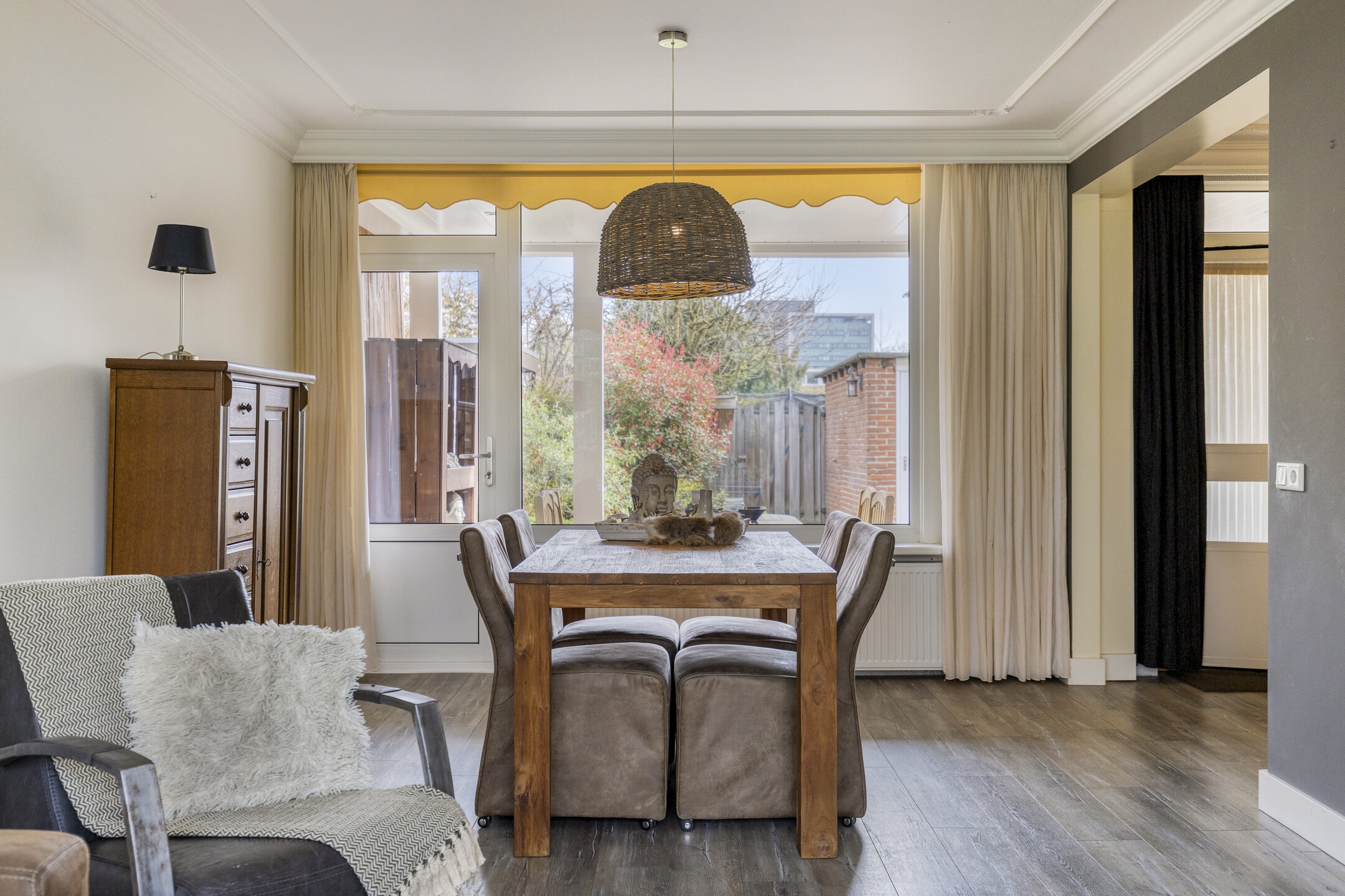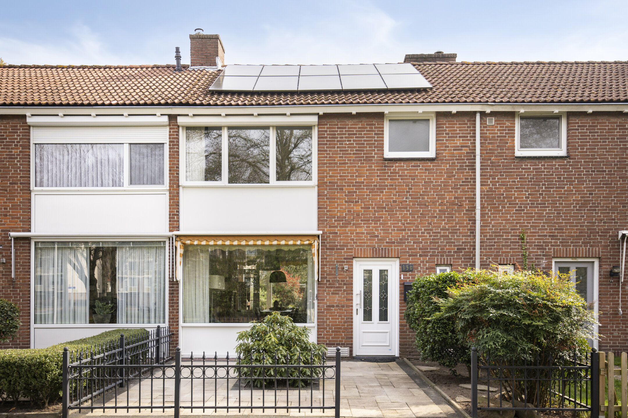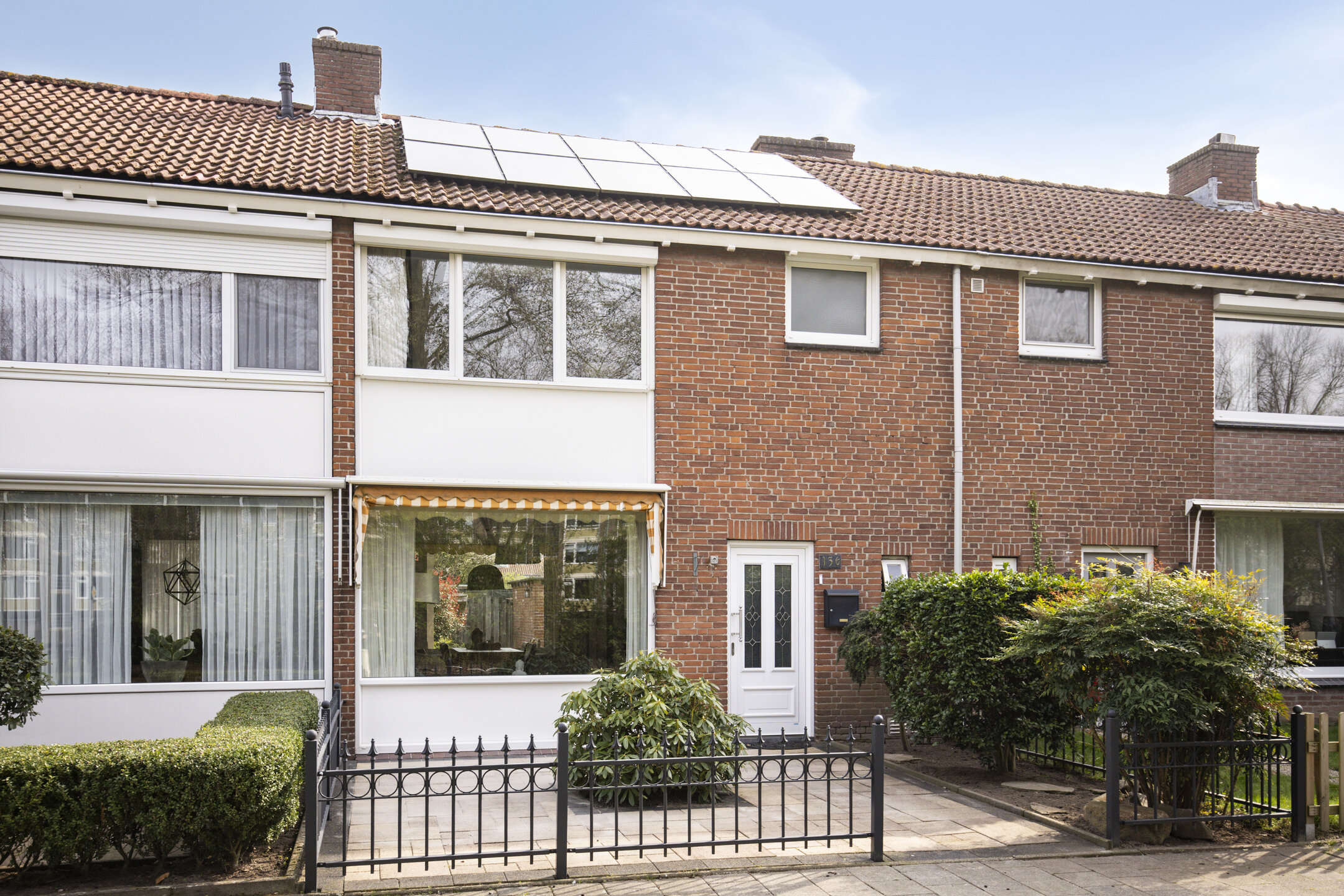Aan de buitenzijde van de raampartij aan de voorzijde hangt een zonneluifel.
