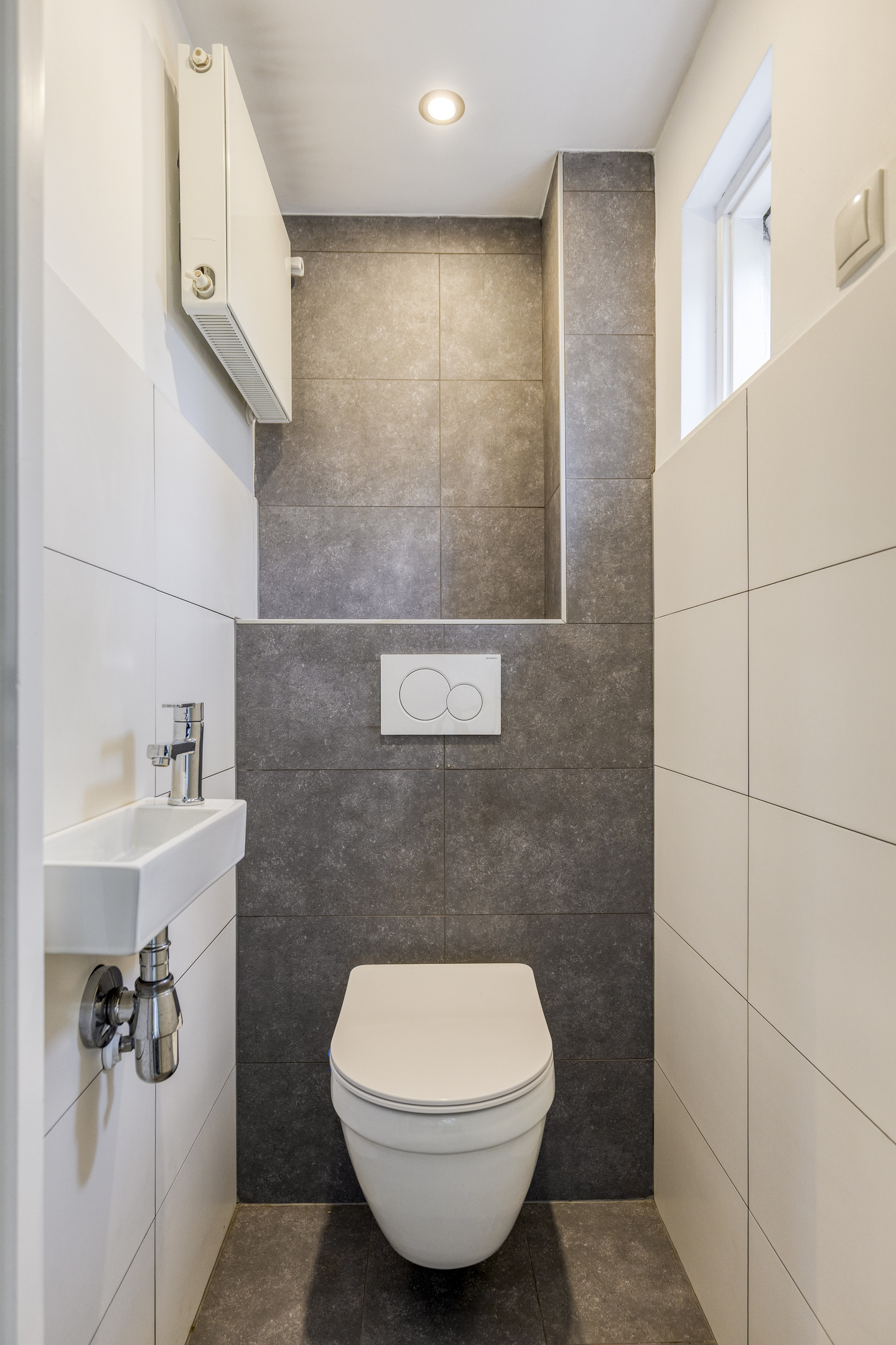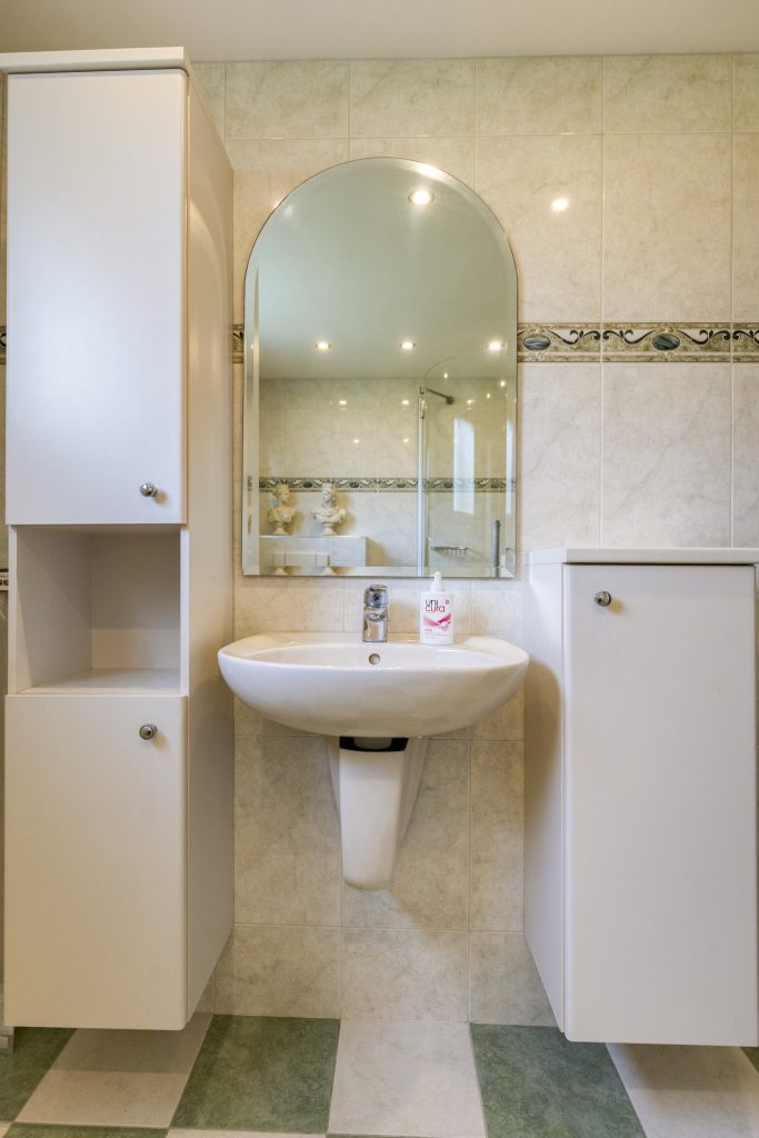 Badkamer, volledig betegeld met Wastafel, twee wandmeubels, toilet, douche en designradiator.