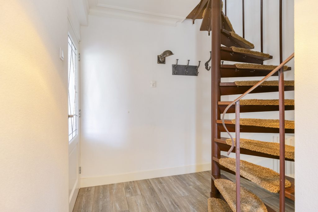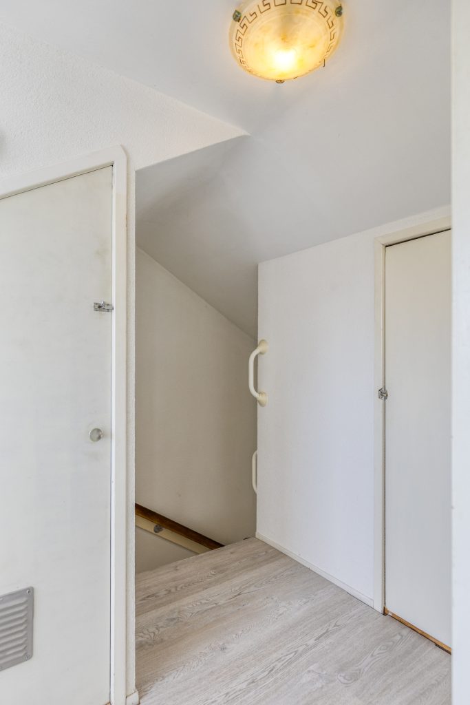 Meterkast, toiletruimte, bergkast, trapopgang en deur naar de woonkamer.