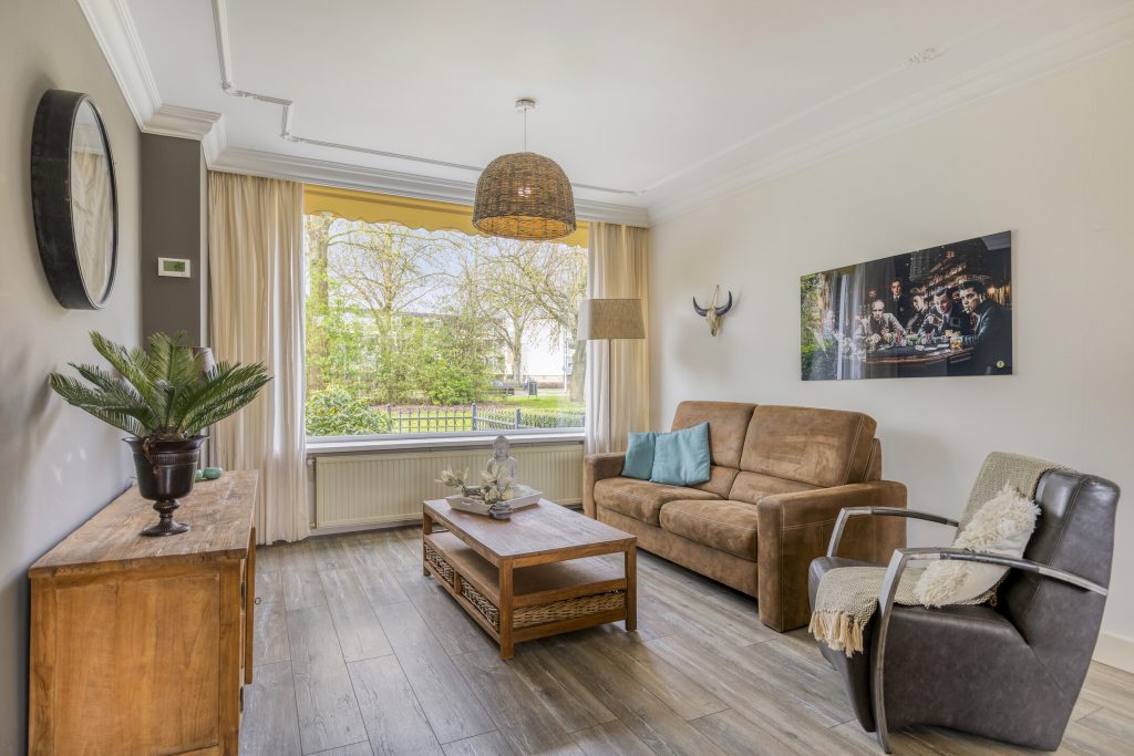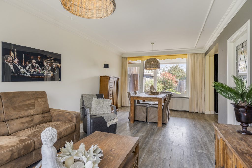 Woonkamer met laminaatvloer, grote raampartijen aan voor- en achterzijde.