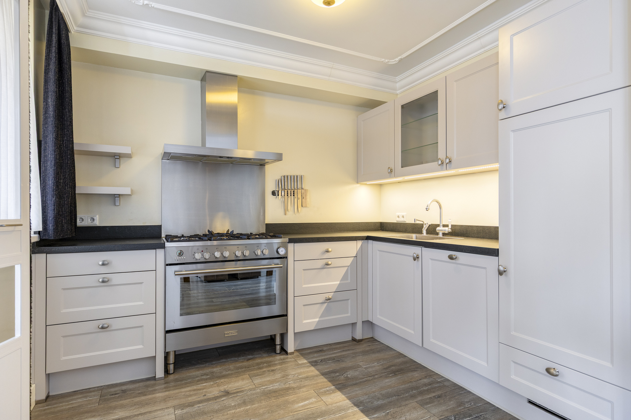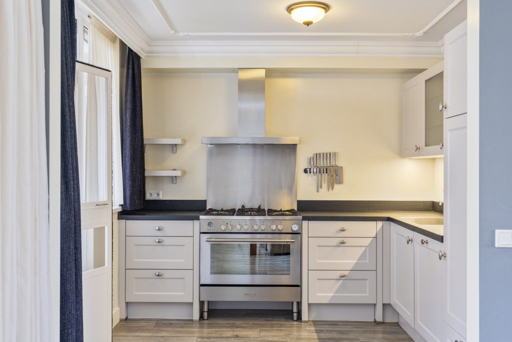 Open kitchen with composite worktop, sink, tap with Quooker system, 6-burner gas stove with XL hob, extractor hood, refrigerator, dishwasher, and ample cupboard space.