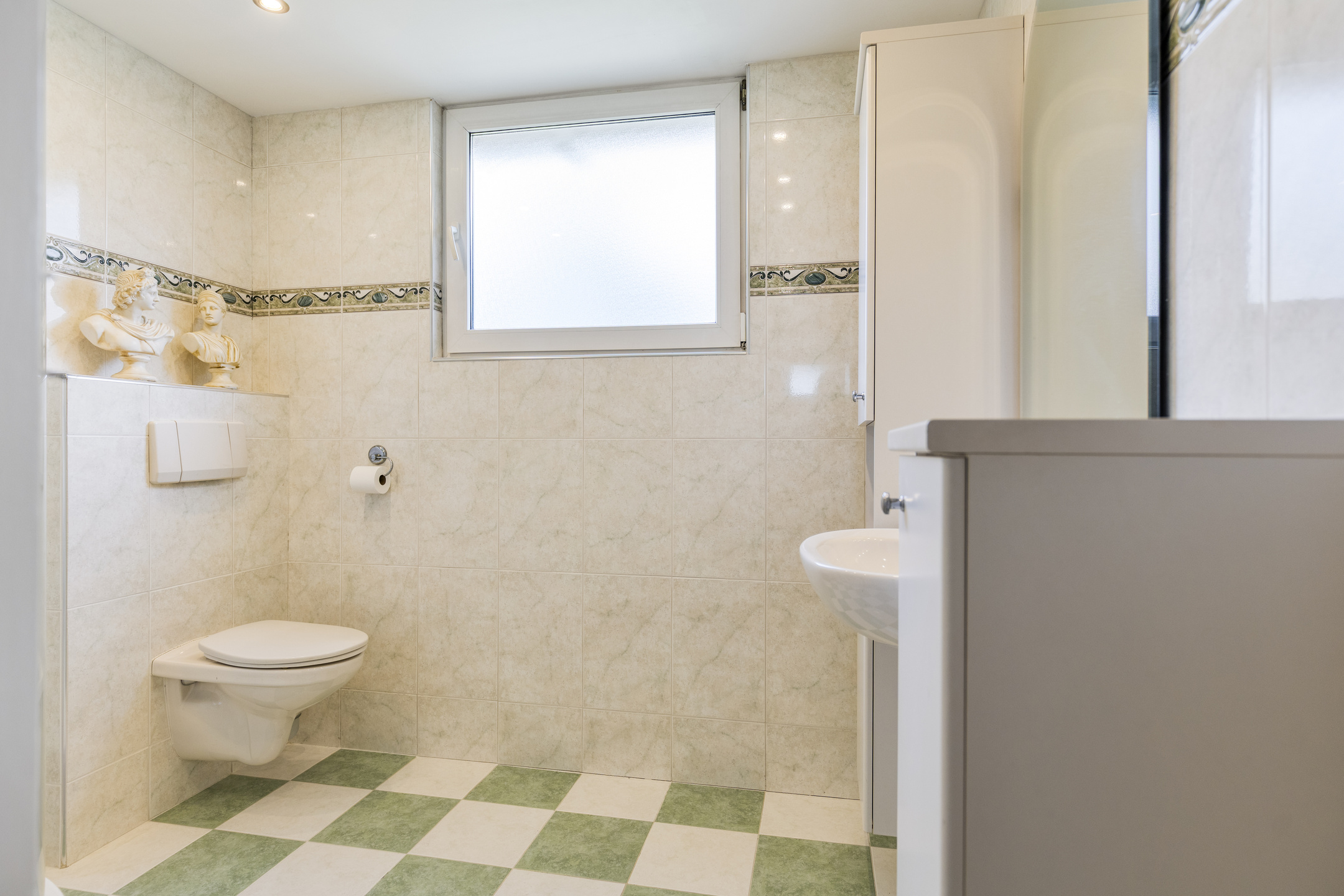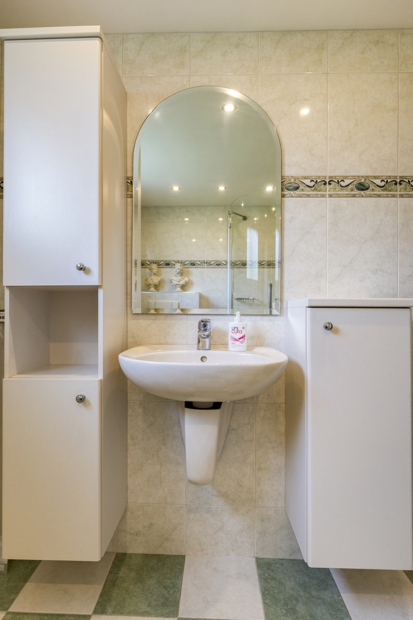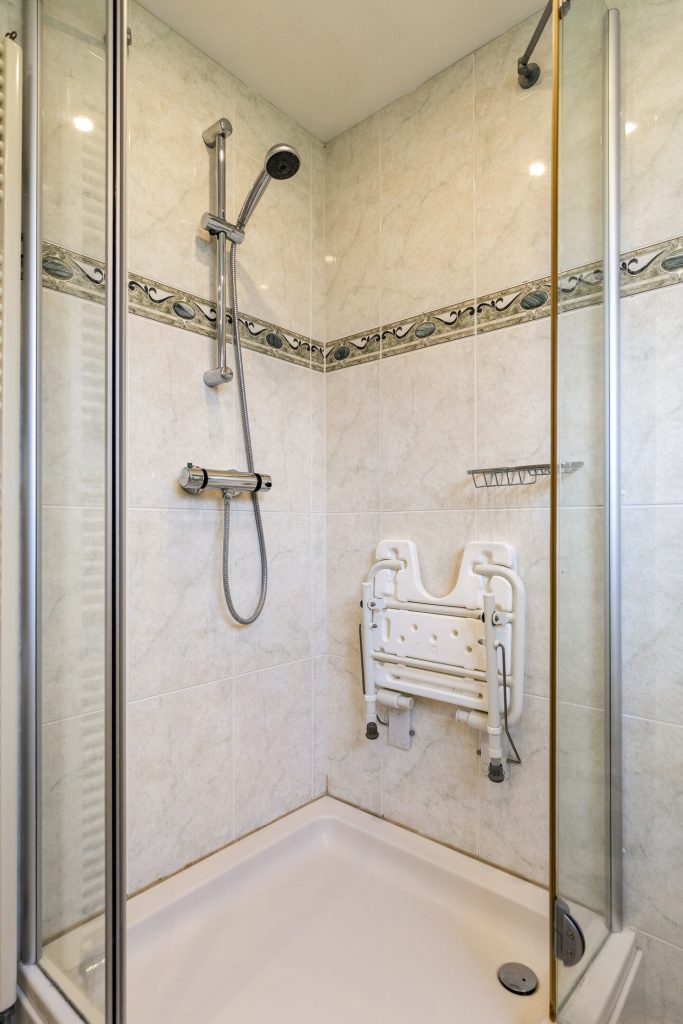 Bathroom, fully tiled with washbasin, two wall units, toilet, shower, and designer radiator.