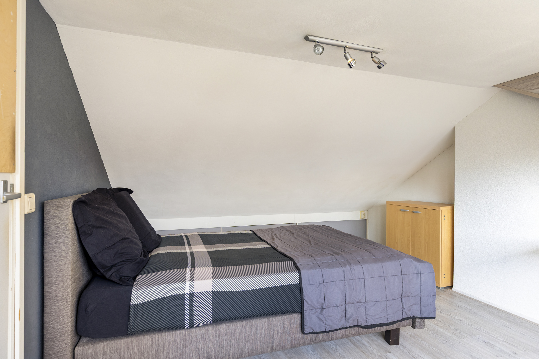 Zolderslaapkamer met laminaatvloer, dakkapel en bergruimte onder de kapschuinte aan beide zijden.
