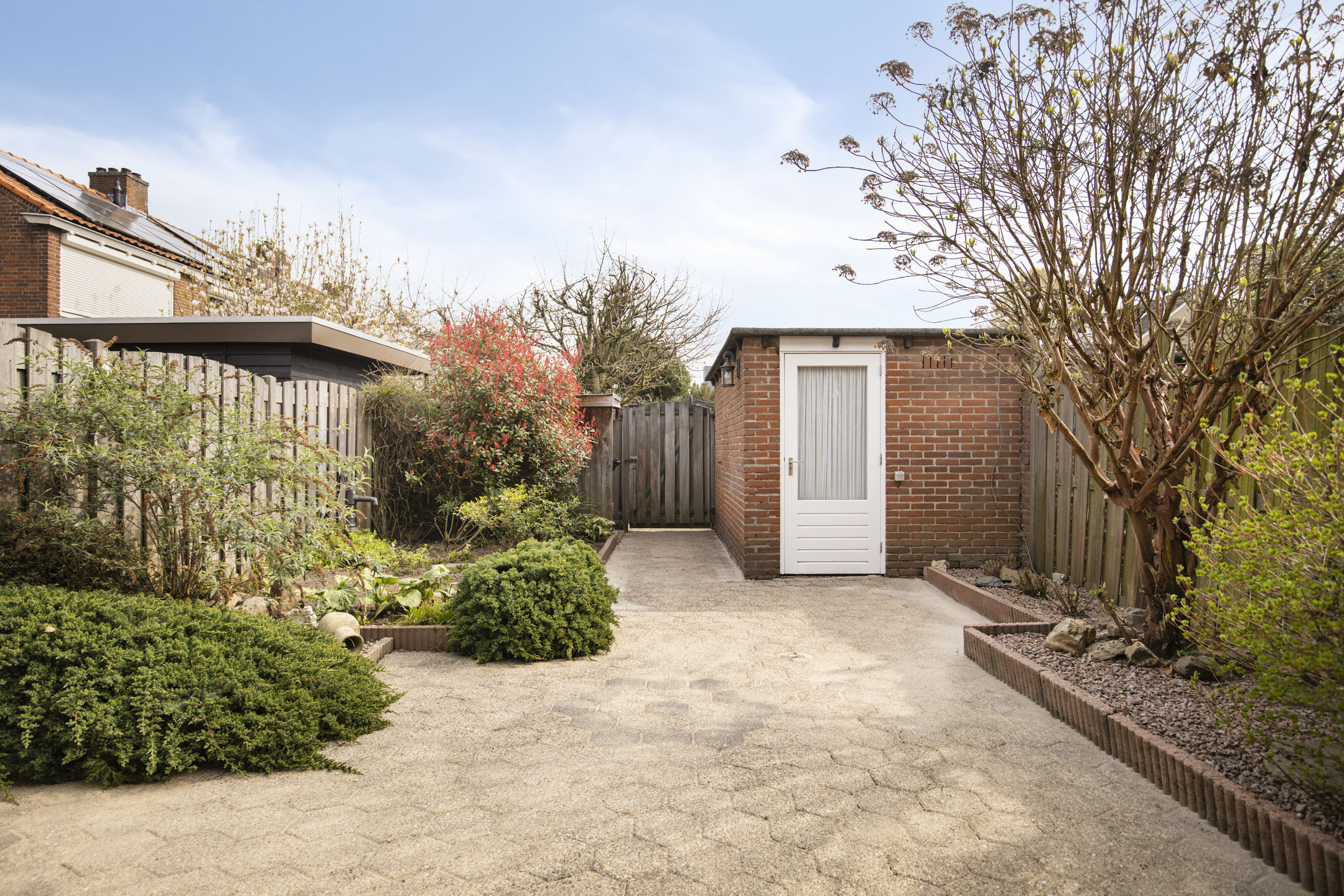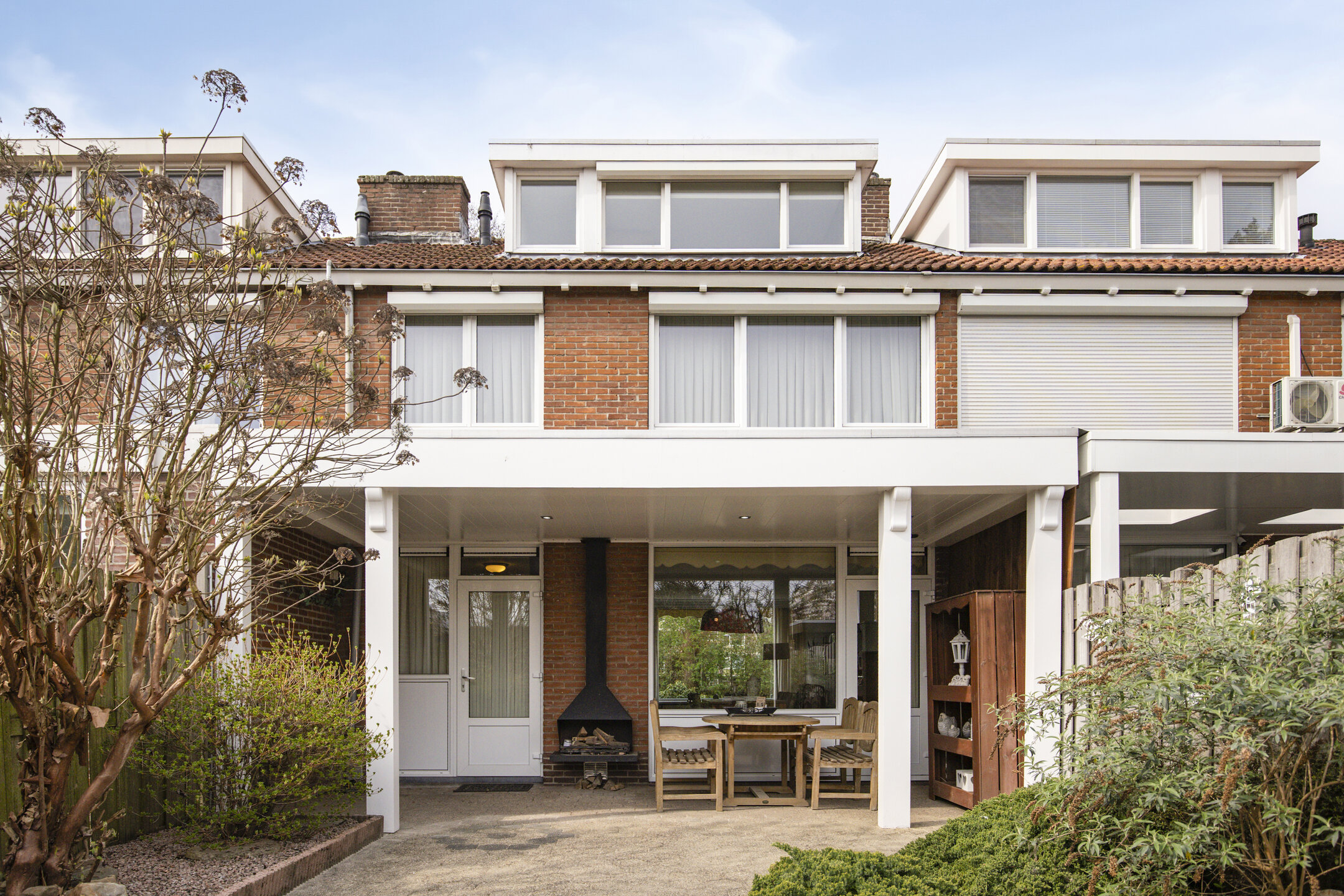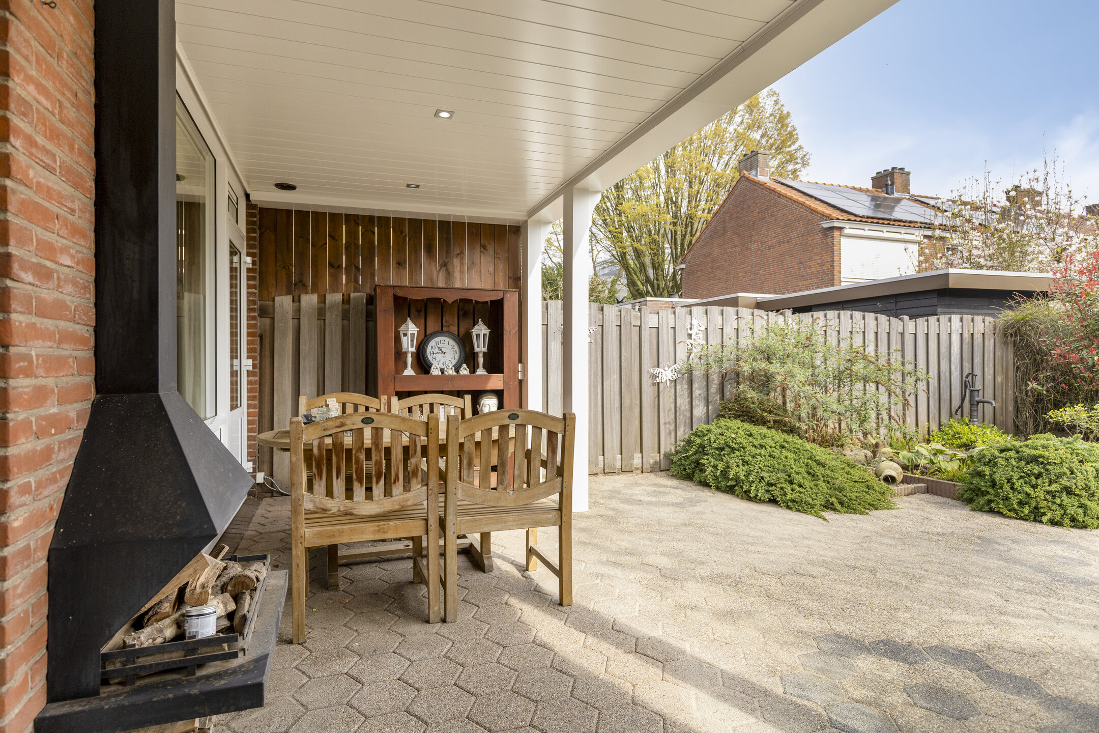 The backyard features a large covered terrace with a wood-burning fireplace, planted borders, a stone shed equipped with electricity, a canopy for wheelie bins and bicycles, and a back entrance.