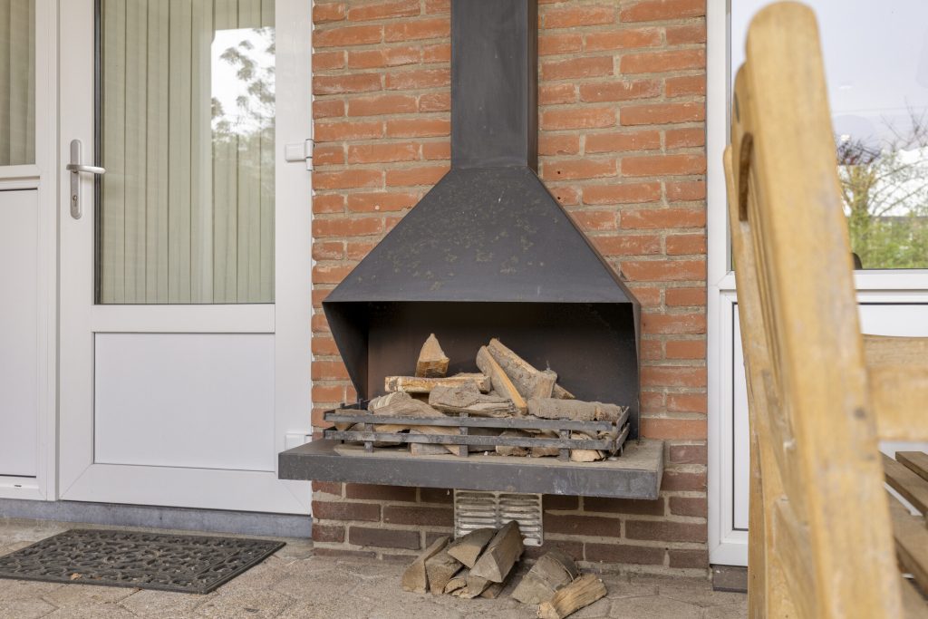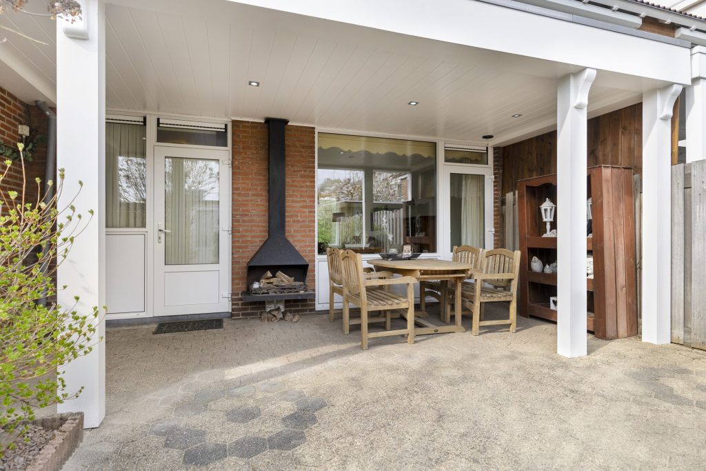 De achtertuin heeft een groot overdekt terras met houthaard, borders met beplanting, stenen berging voorzien van elektra, overkapping voor kliko’s en fietsen en een achterom.