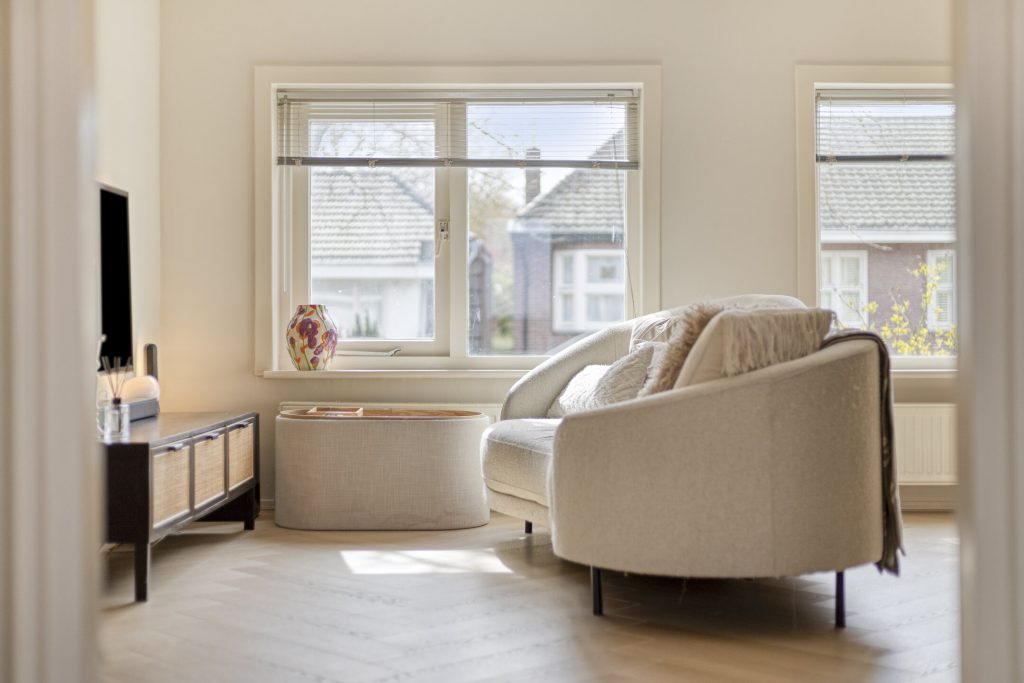 • Lichte living: Een ruime woonkamer met grote raampartijen aan de voorzijde.
