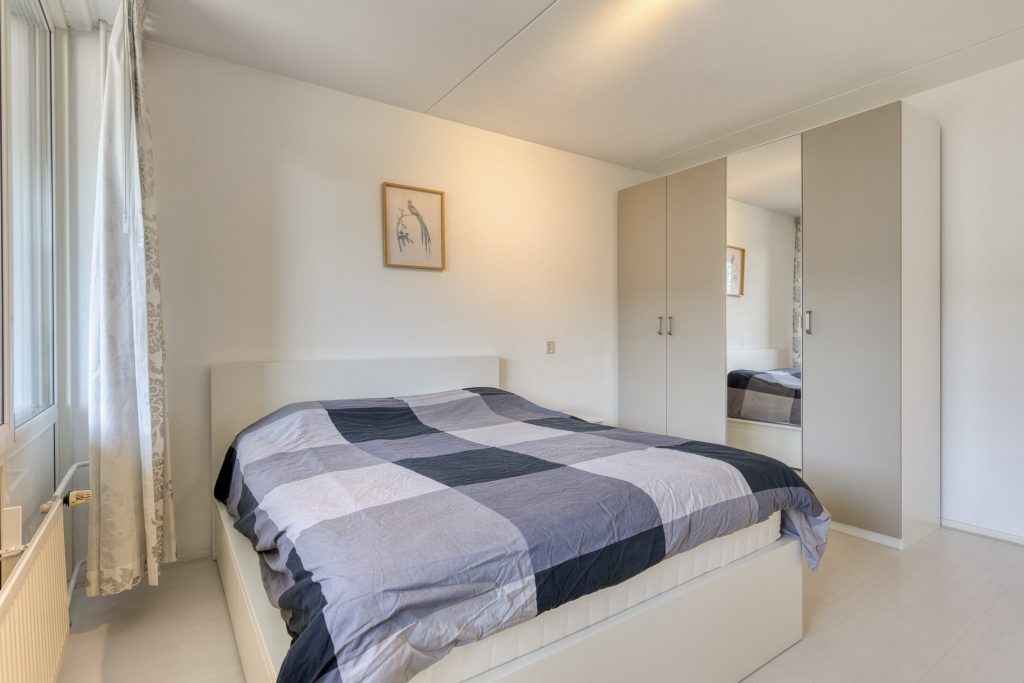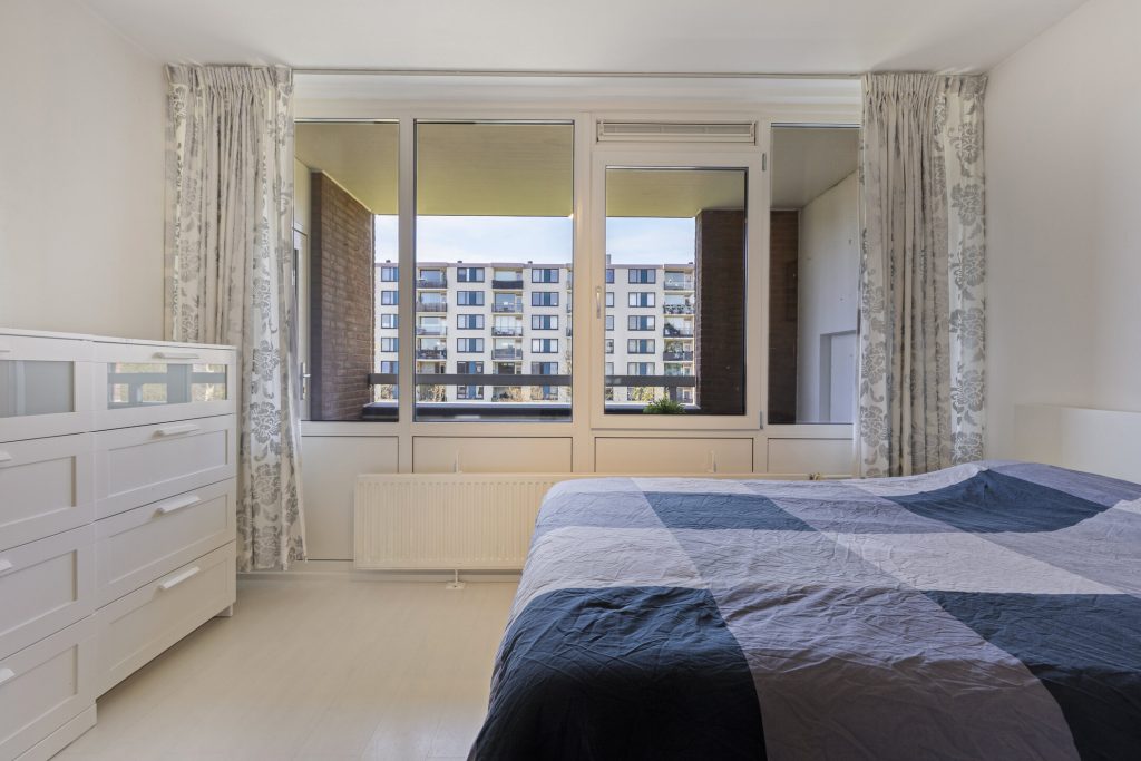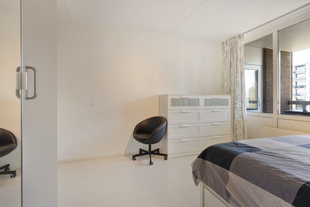 Wat een ruime slaapkamer! Ook hier veel lichtinval vanwege de grote raampartij die uitzicht biedt naar het inpandige balkon. Op de vloer ligt een frisse, lichte laminaat. Er is genoeg ruimte voor een groot bed, kastenwand, werkplek of zitje.