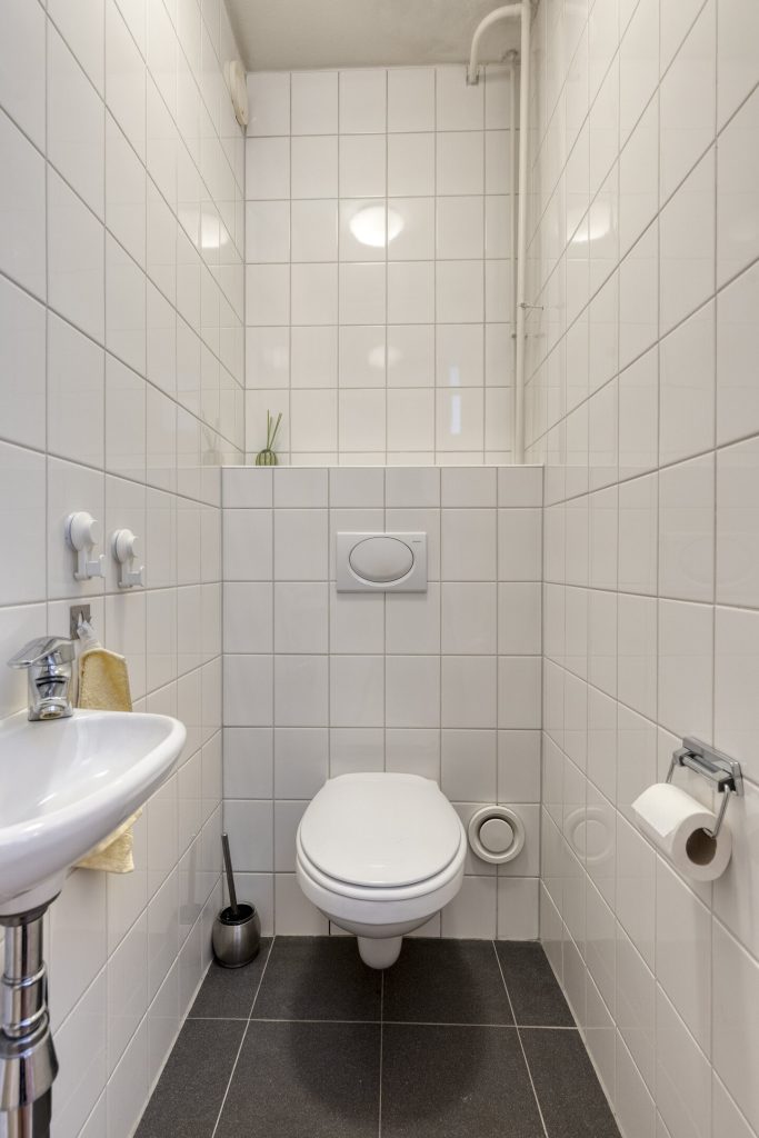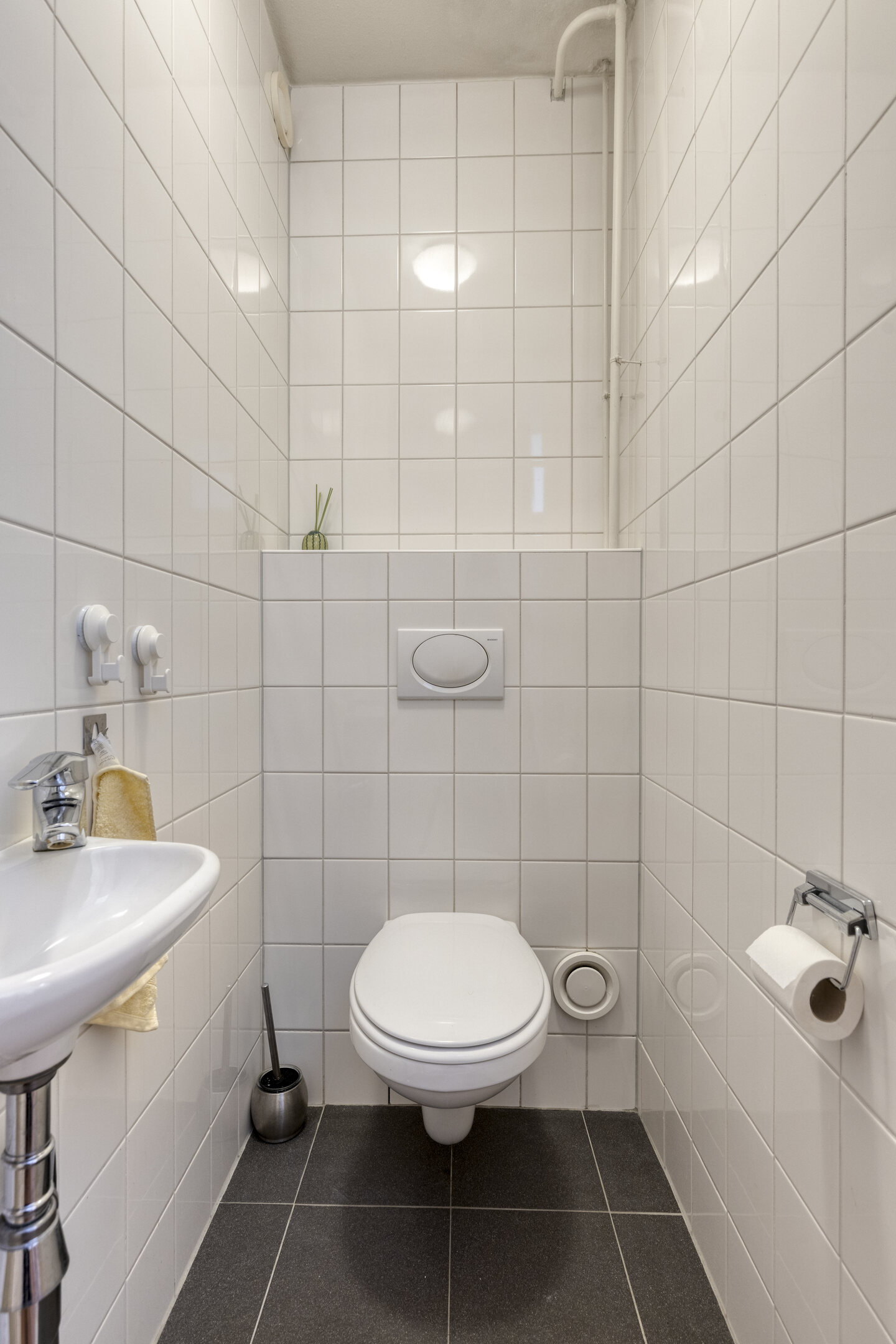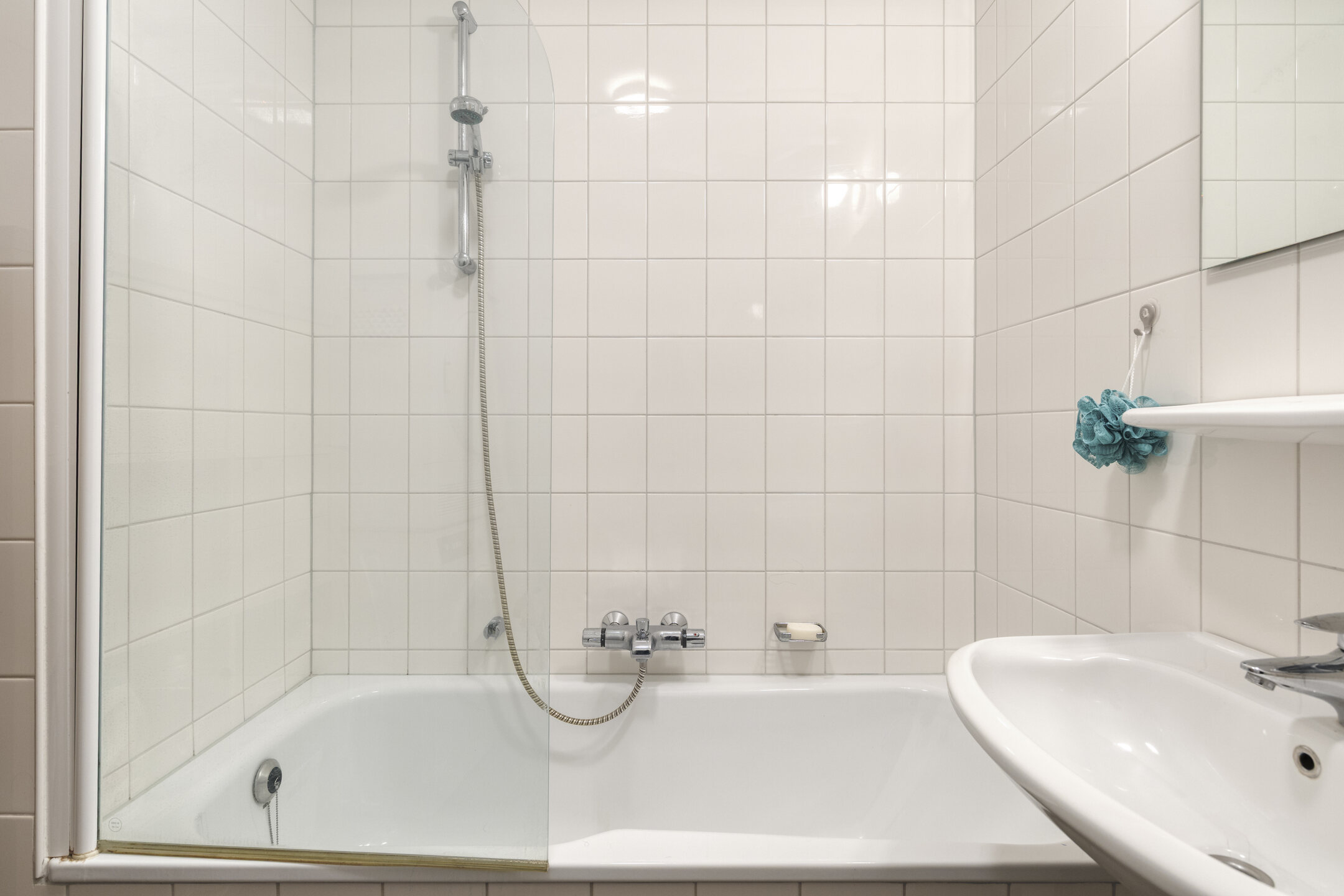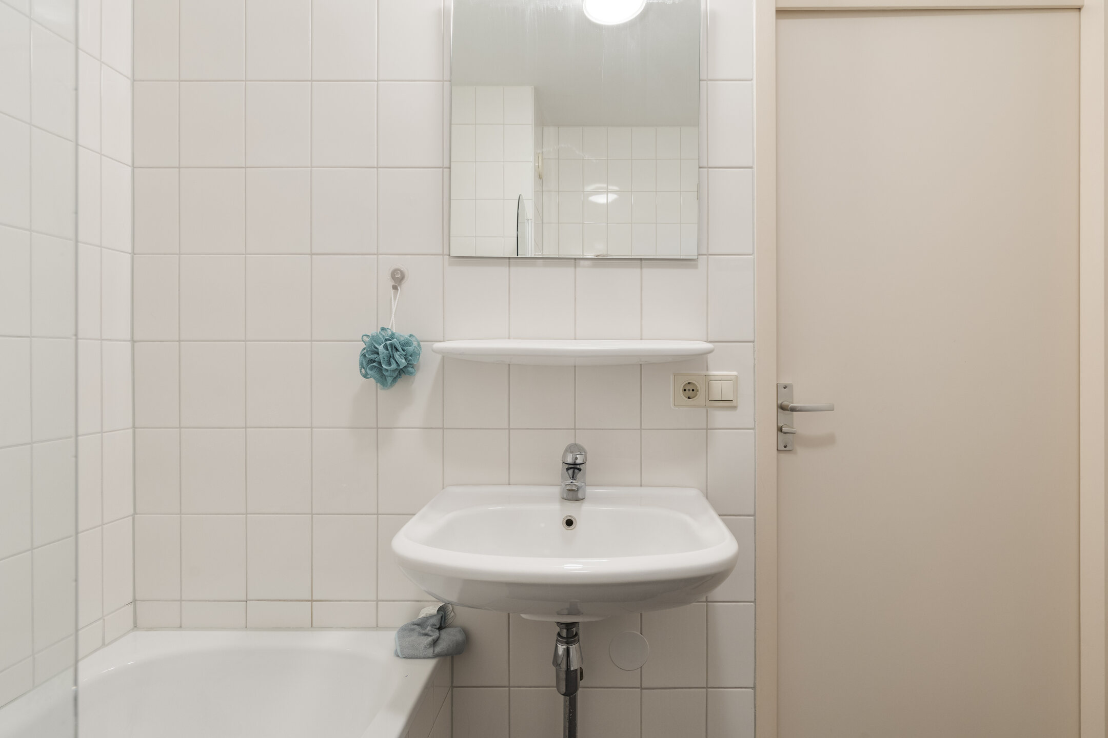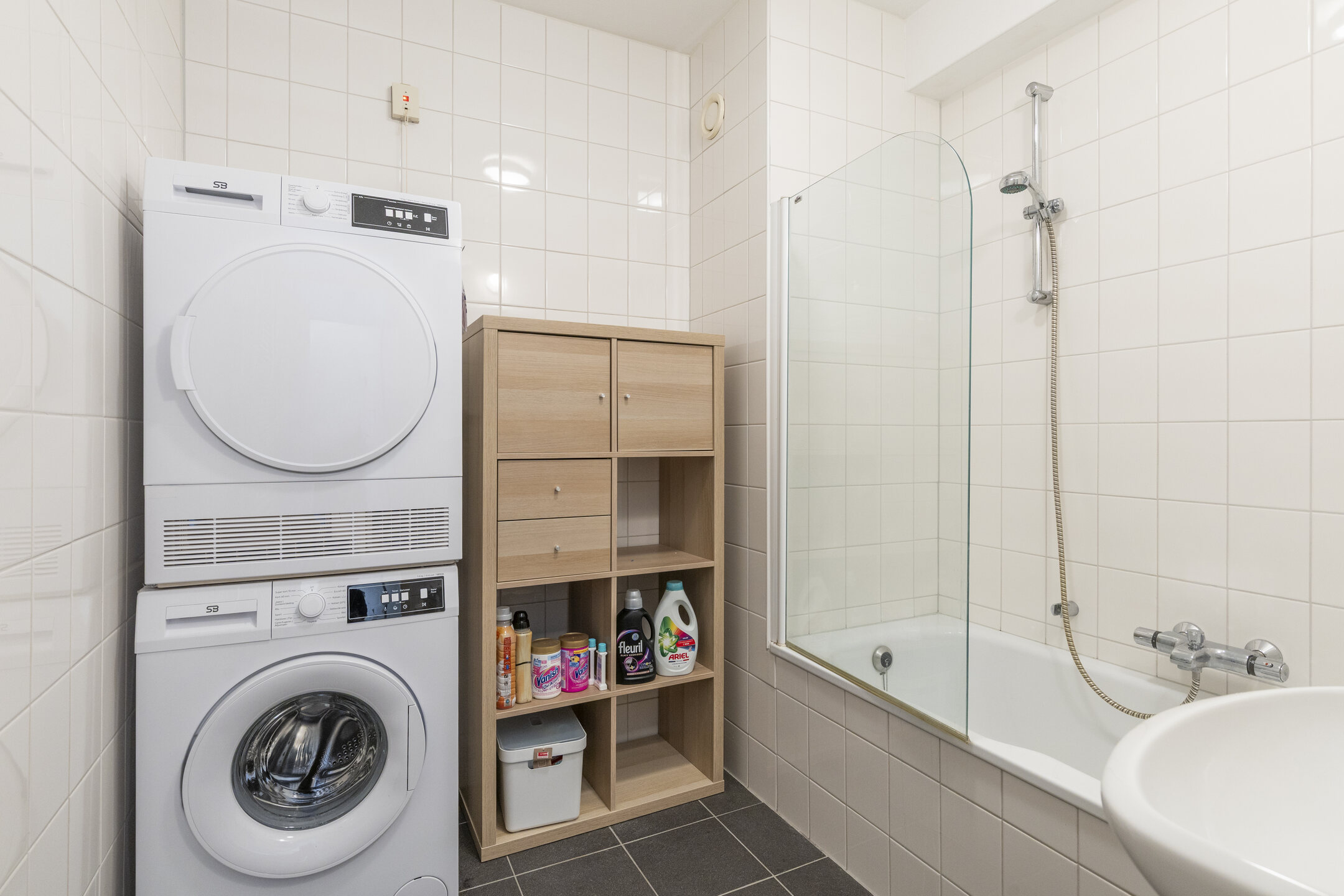 De volledig betegelde badkamer heeft een ligbad met een thermostaatkraan en douchegelegenheid. De friswitte tegels worden hier gecombineerd met een mooie antracietkleurige vloertegel. De wastafel heeft een planchet voor je toiletartikelen met daarboven een spiegel en verlichting. Er is een aansluiting voor een wasmachine en droger. De designradiator zet het puntje op de i.