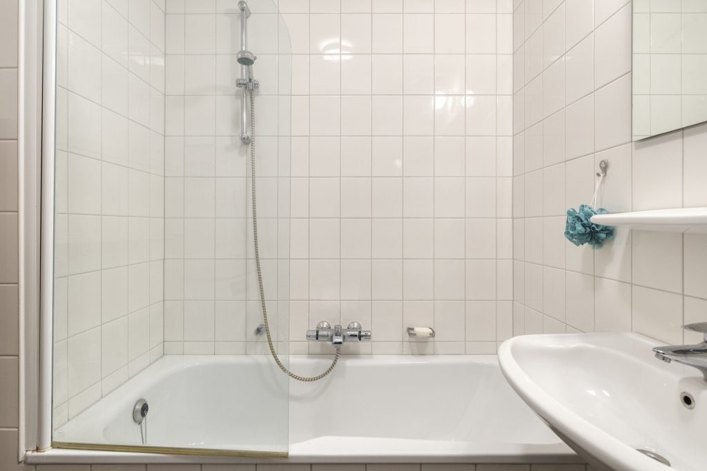 The fully tiled bathroom features a bathtub with a thermostatic tap and a shower. The crisp white tiles are combined here with a beautiful anthracite-colored floor tile. The vanity features a shelf for your toiletries, with a mirror and lighting above it. There is a connection for a washing machine and dryer. The designer radiator adds the finishing touch.
