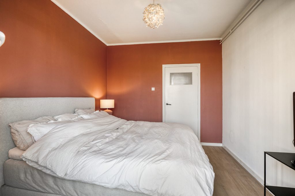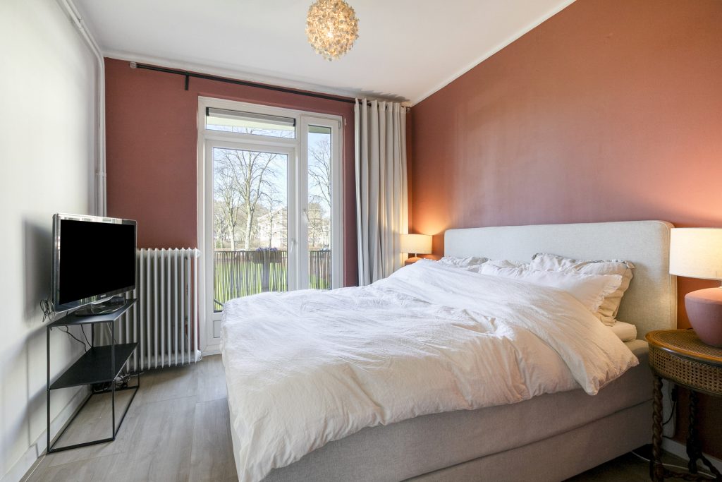 Slaapkamer 1 is gelegen aan de voorzijde, voorzien van een laminaatvloer en geeft toegang tot het balkon aan de voorzijde van het complex met heerlijk uitzicht over het groenplantsoen. Hier geniet men van veel lichtinval.