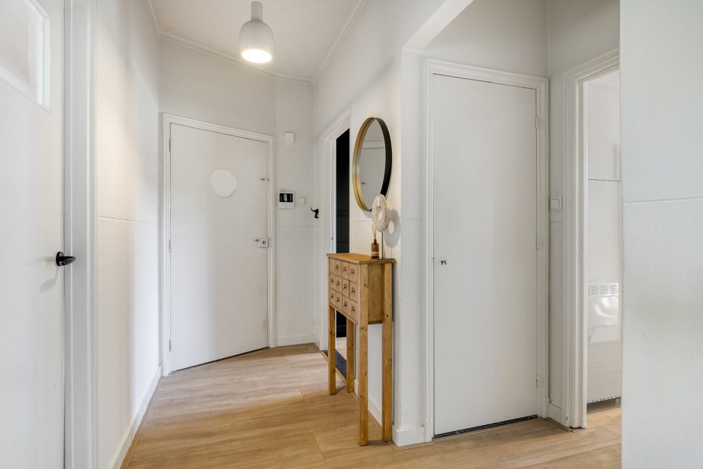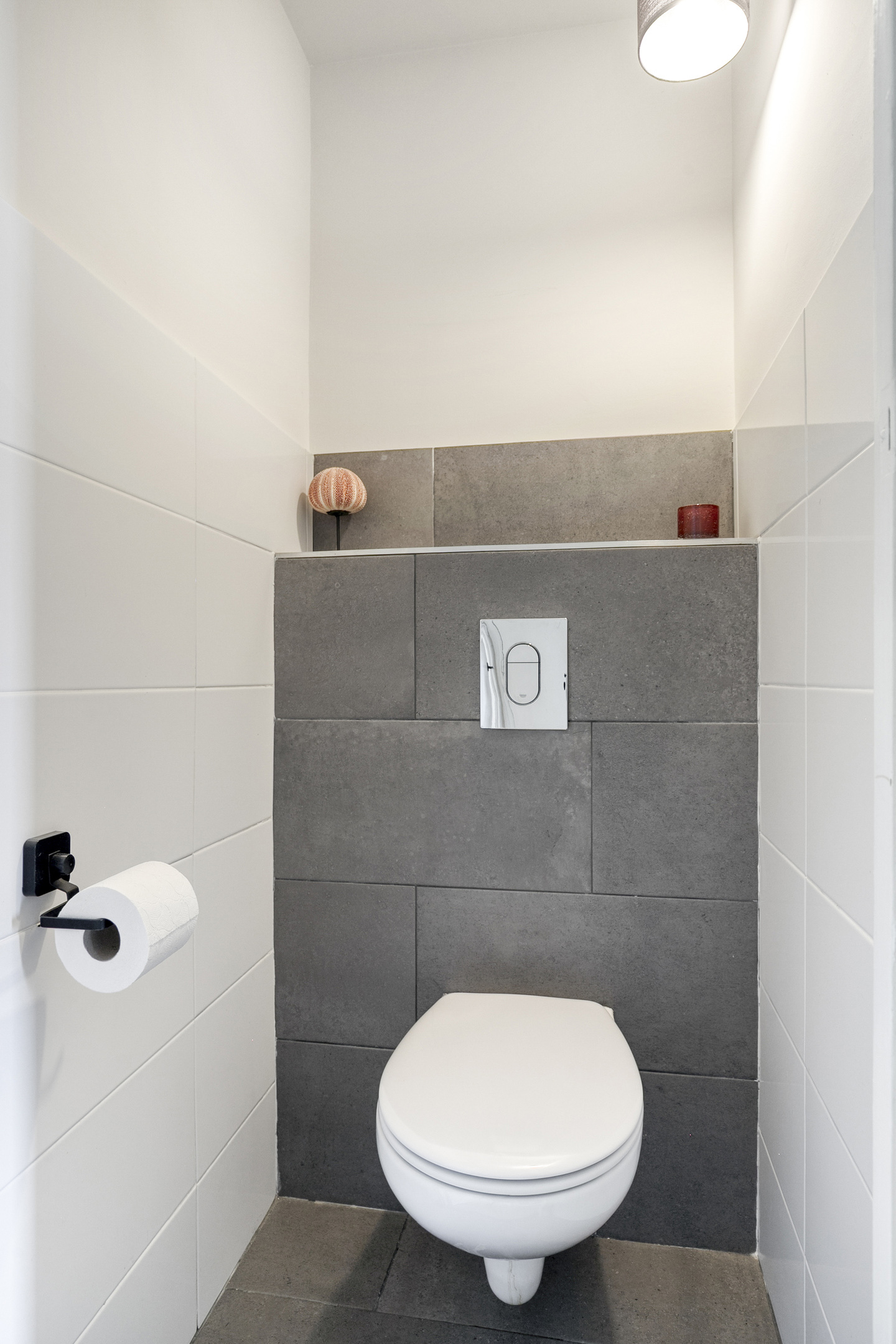 Entree/hal met een vaste kast en een gedeeltelijk betegeld toilet met een zwevend closet. Geheel voorzien van een laminaatvloer. De hal geeft ook toegang tot de 2 slaapkamers, keuken en woonkamer.