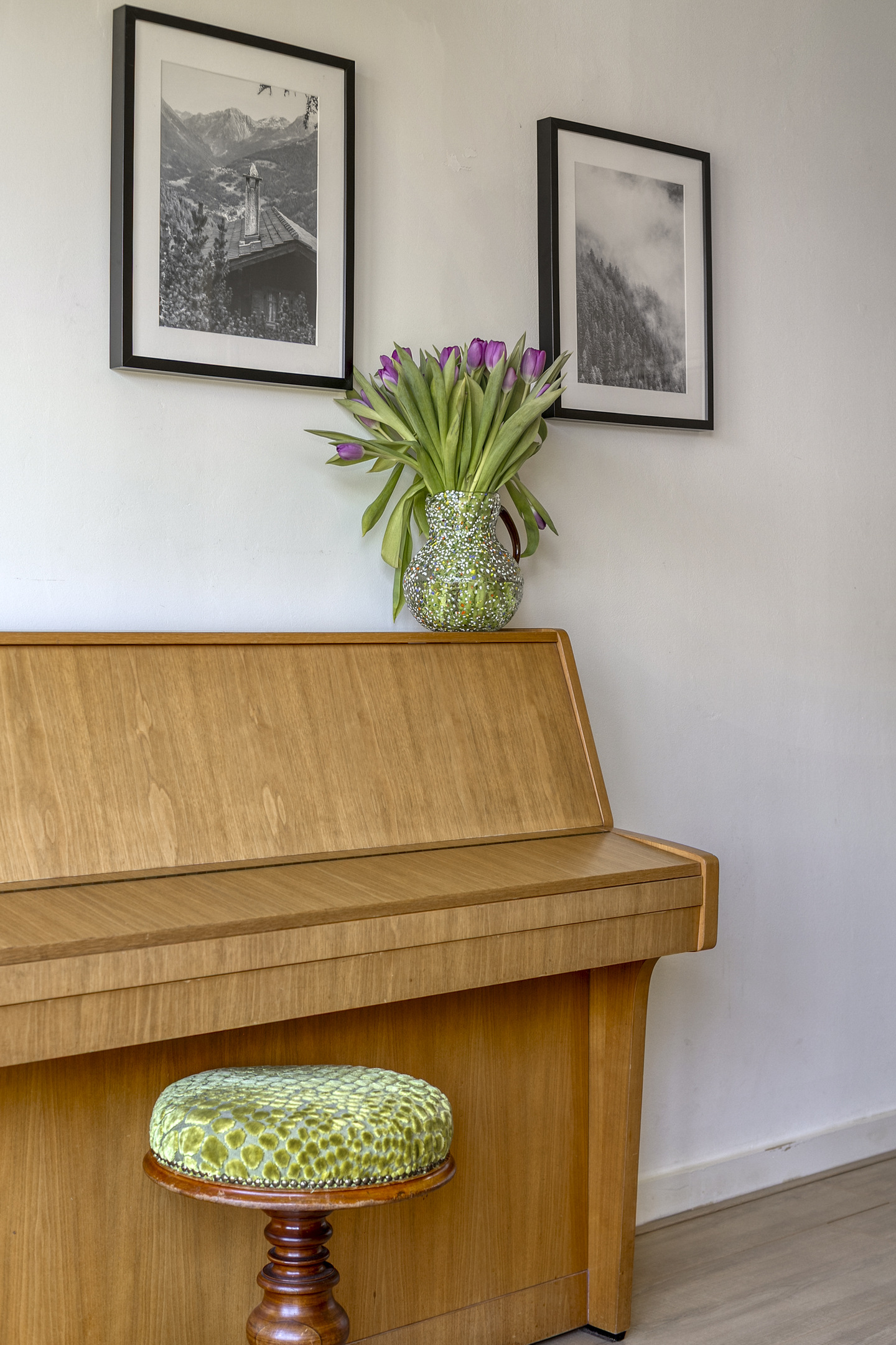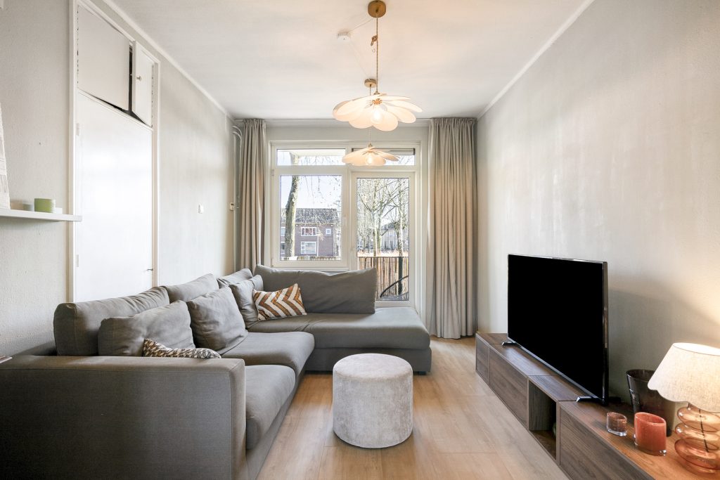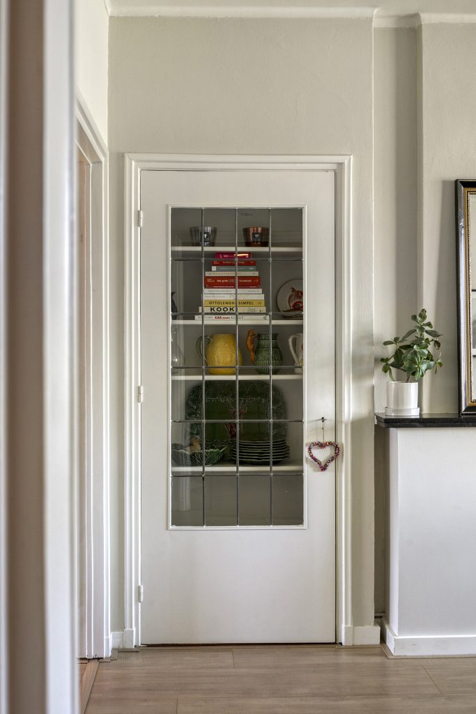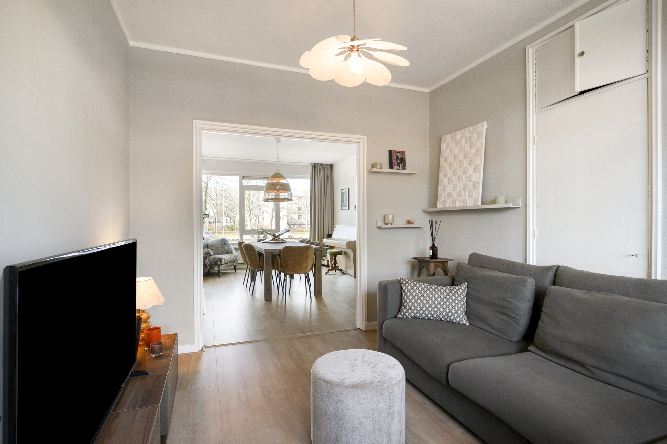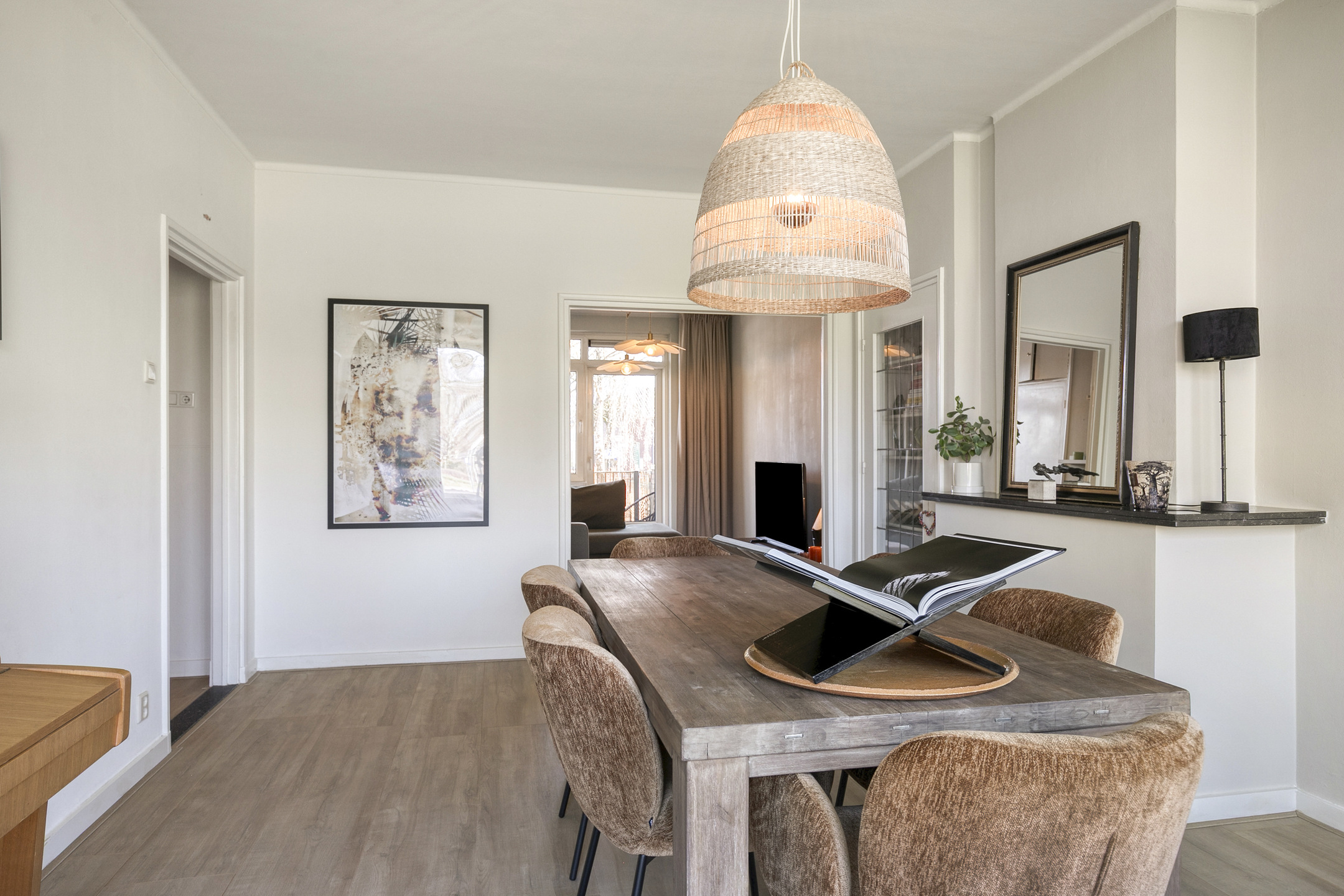 Living met aan de voorzijde het eetkamer gedeelte en aan de achterzijde het zitgedeelte met toegang tot ruim balkon aan de achterzijde. In het eetkamergedeelte is nog een authentieke bergkast met glas- in- lood deur.