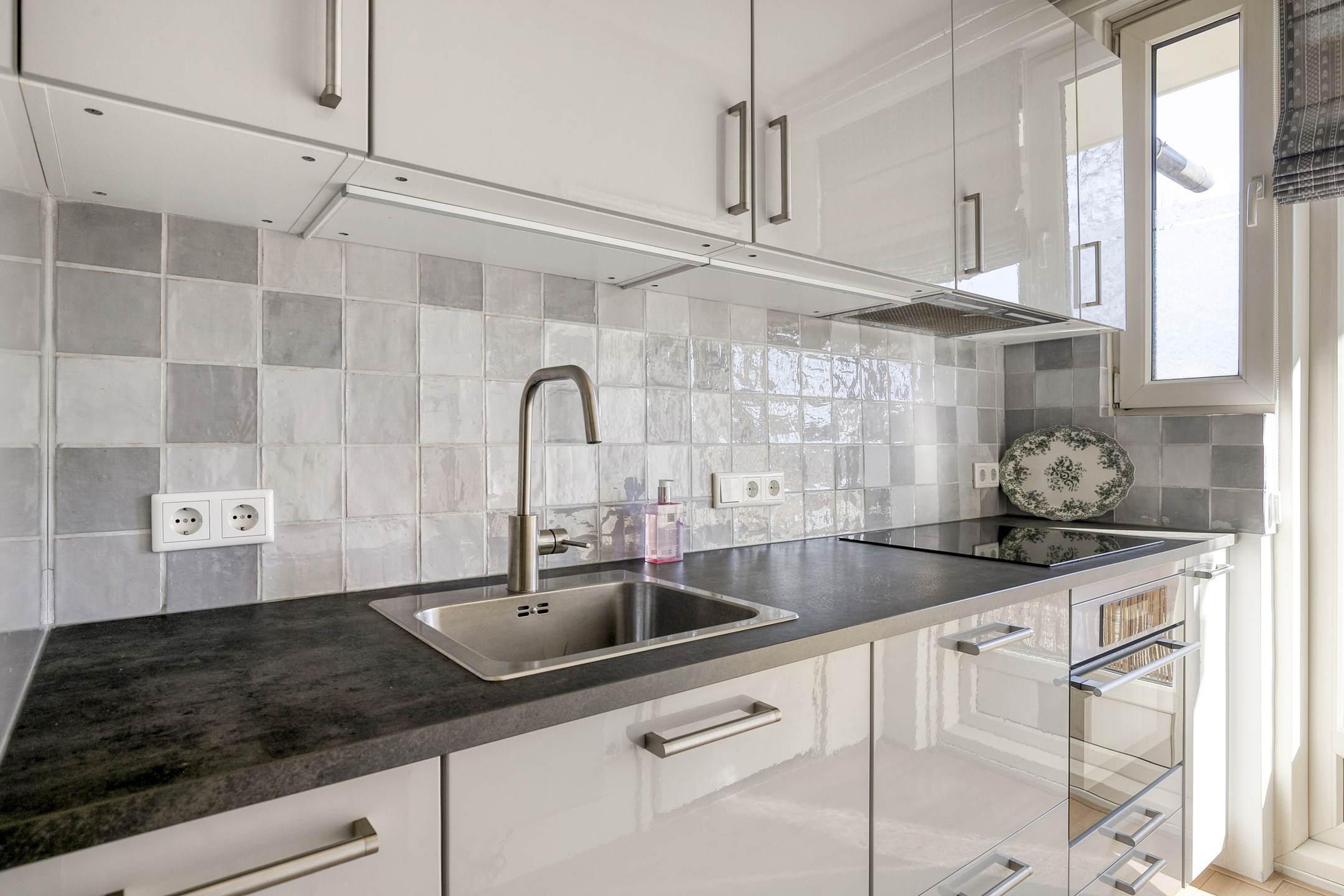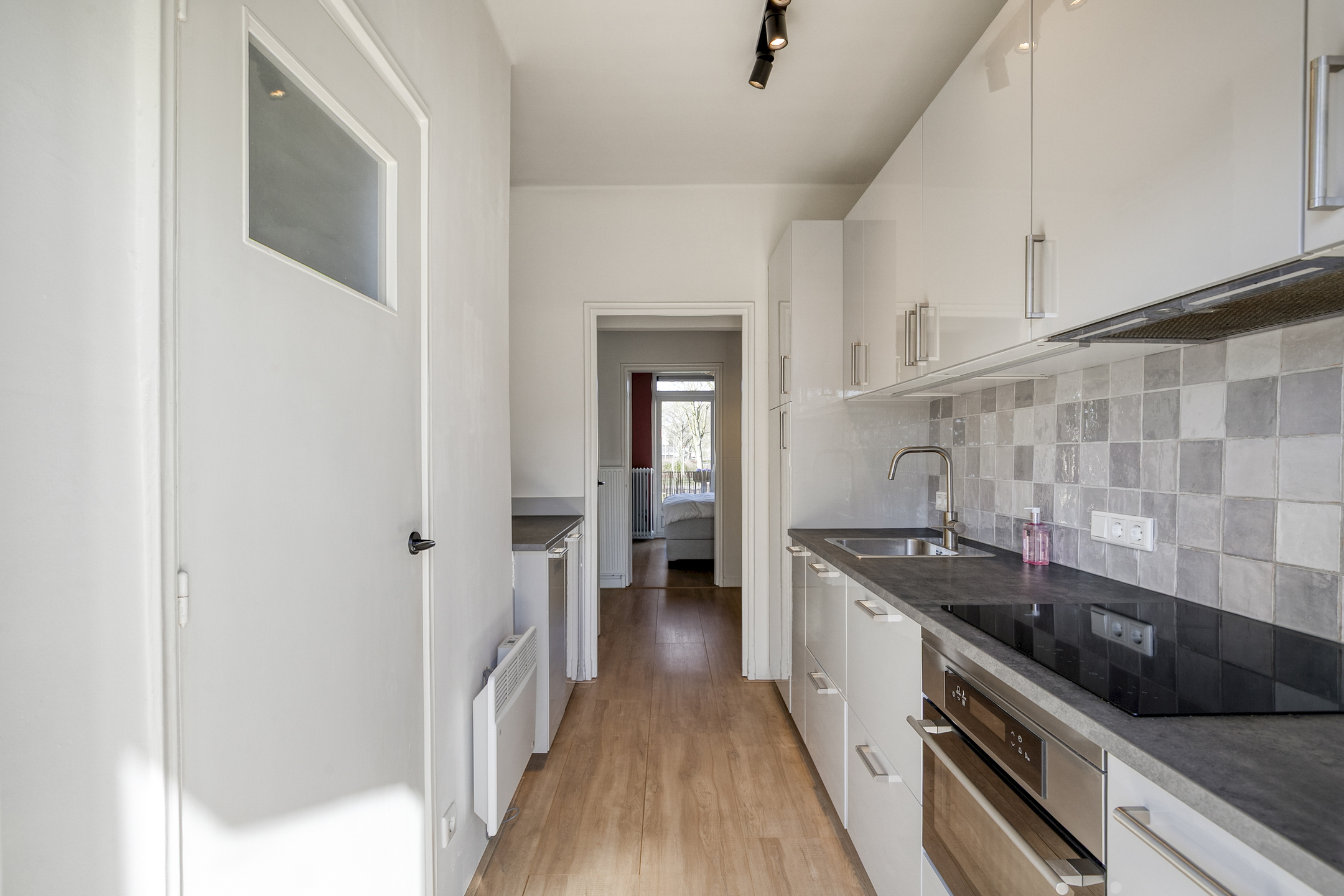Afzonderlijke moderne en luxe keuken met kunstsfof aanrechtblad, 4-pits inductie kookplateau, afzuigkap, combi/magnetron oven en koelkast. Veel kastruimte, onder -en bovenkastjes en een extra werkblad met daaronder kastruimte en de vaatwasser. Deur naar het zonnig balkon eveneens aan de achterzijde van het complex.