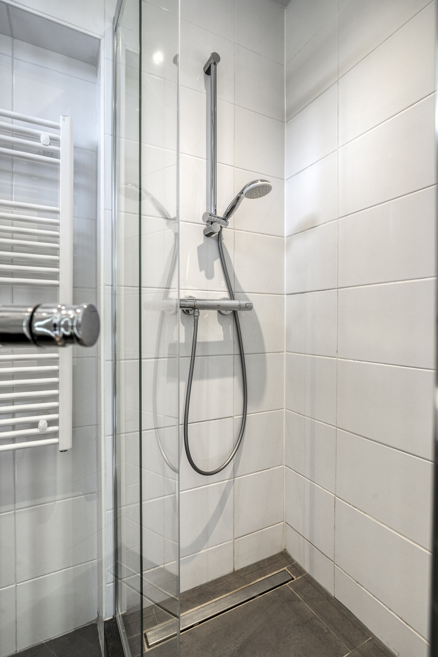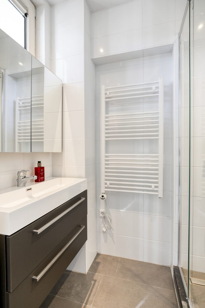 Geheel betegelde badkamer met douche, wastafel in meubel, spiegelkast en designradiator.