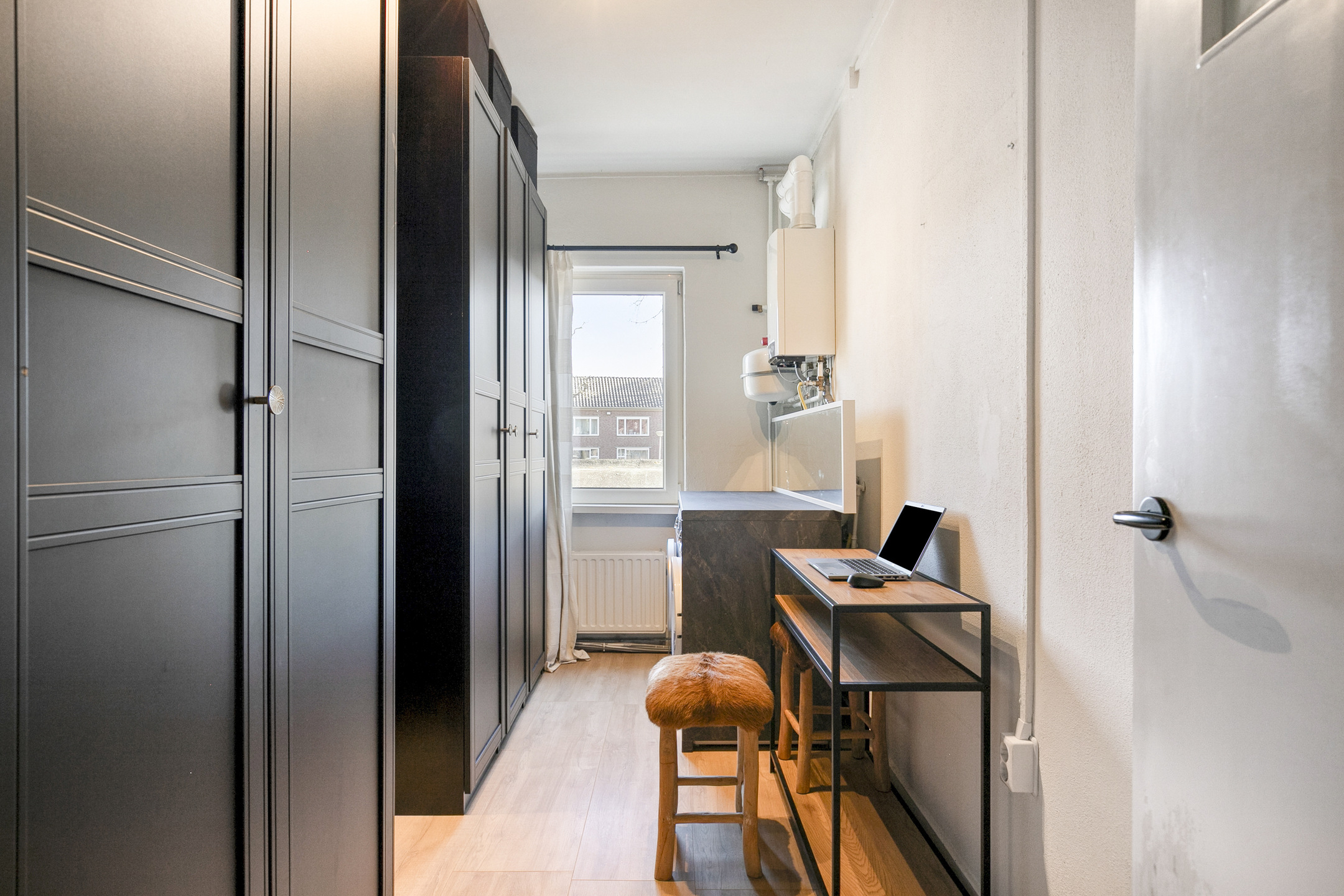 Slaapkamer 2 is gelegen aan de achterzijde, eveneens met laminaatvloer en nu in gebruik als kledingkamer. Deze kamer heeft 2 grote losse kledingkasten, aansluiting was- en droogapparatuur, bergkast en de opstelling van de cv ketel (2014).