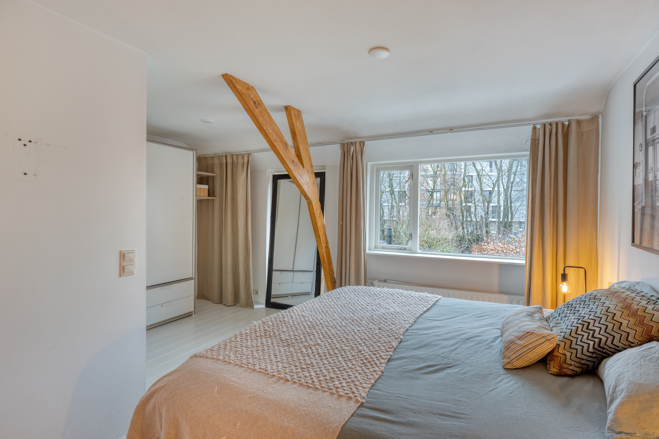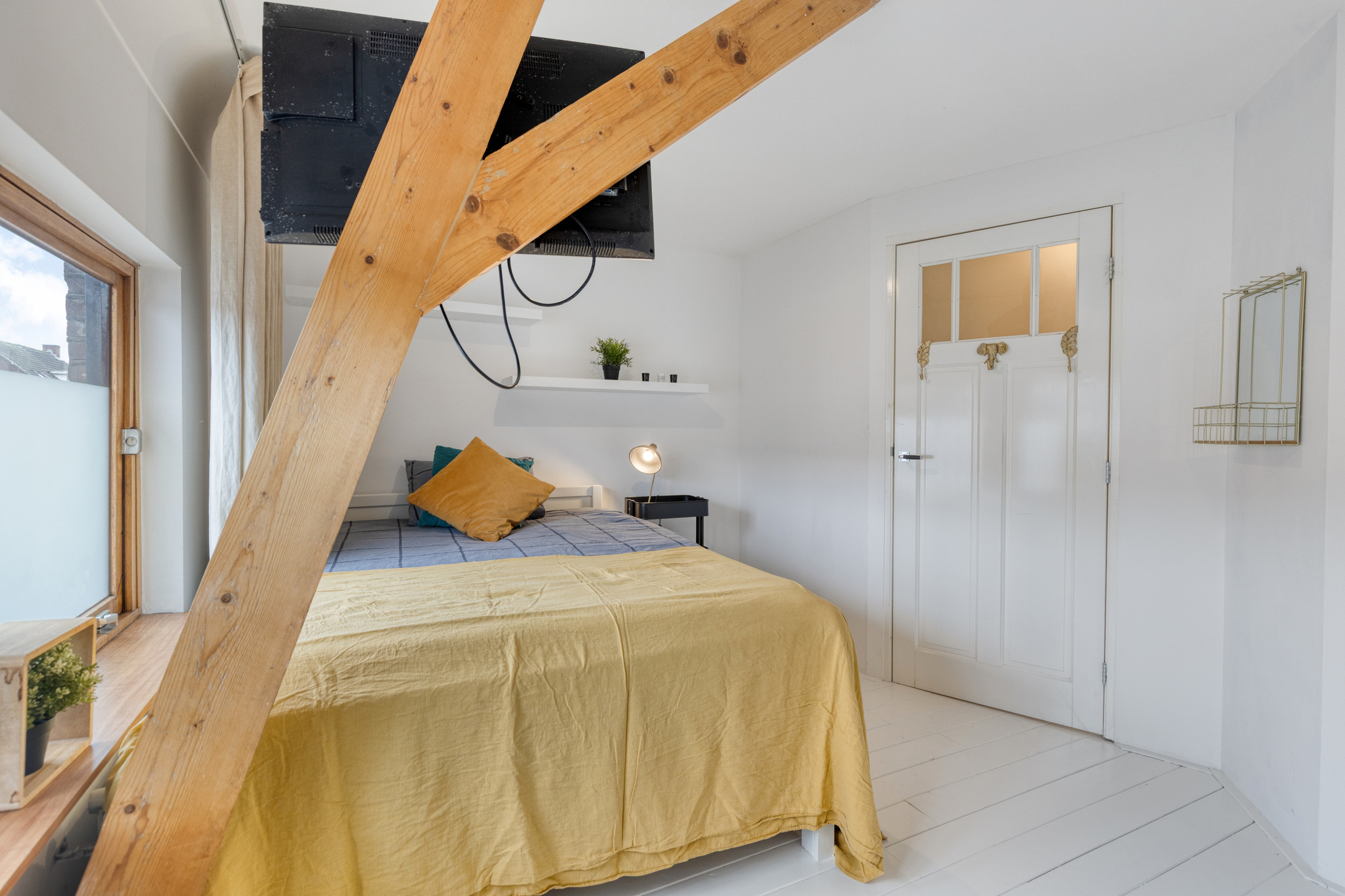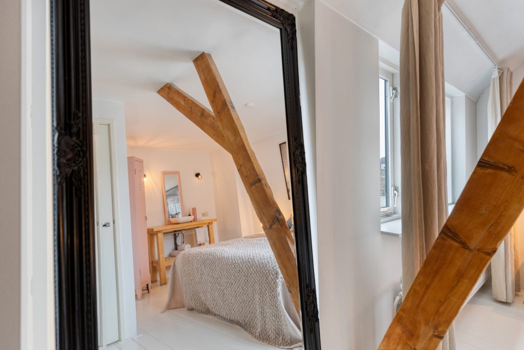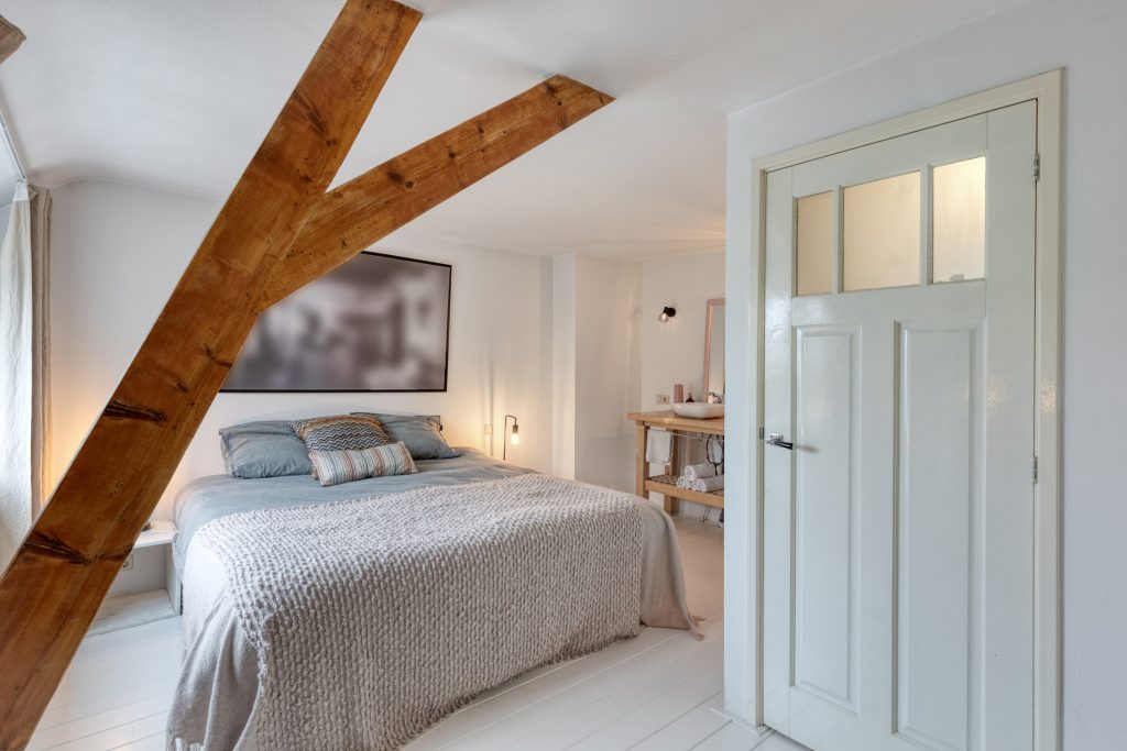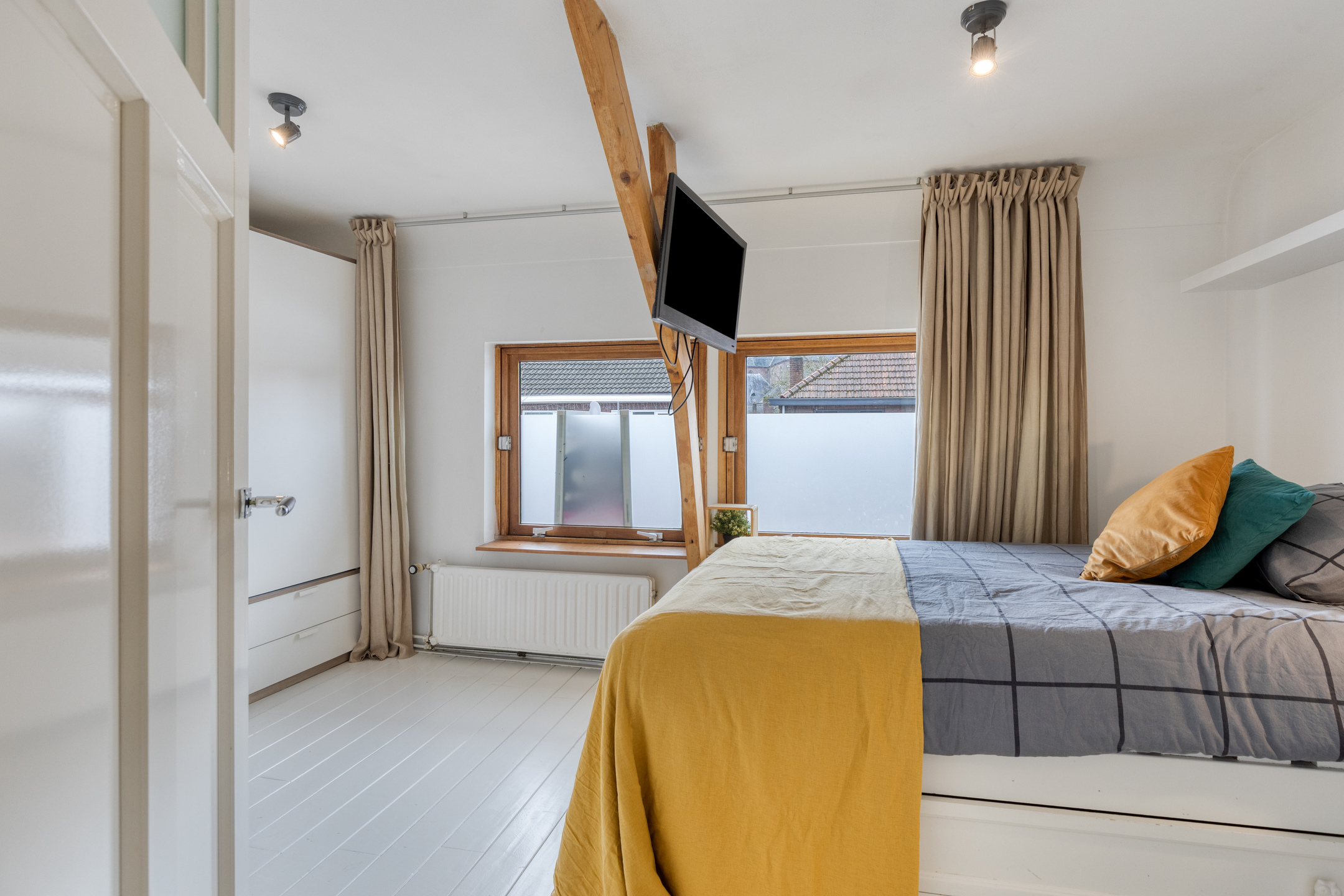 Slaapkamer 1 is gelegen aan de voorzijde met een houten vloer, 2 raampartijen en een fraaie authentieke houten balken dakconstructie in het zicht geeft het geheel een fraai uiterlijk.