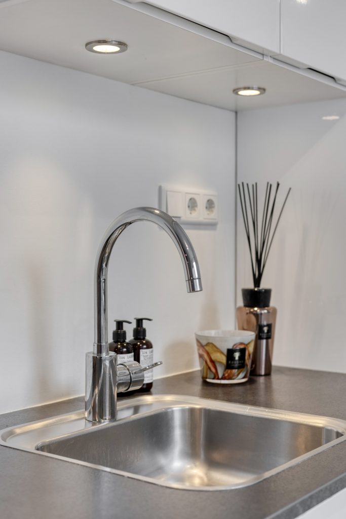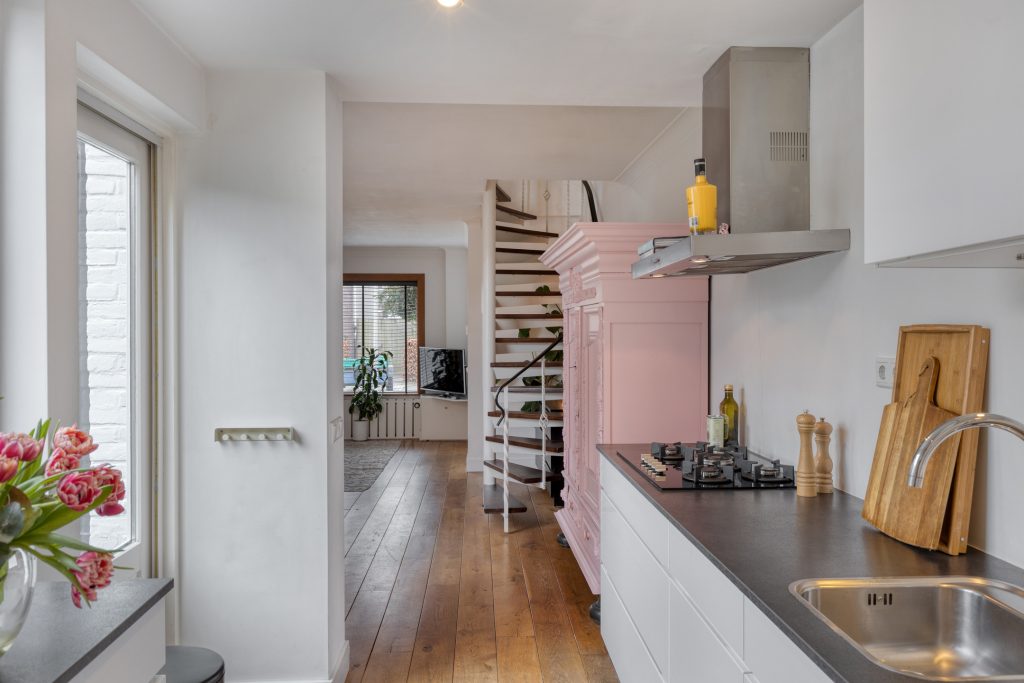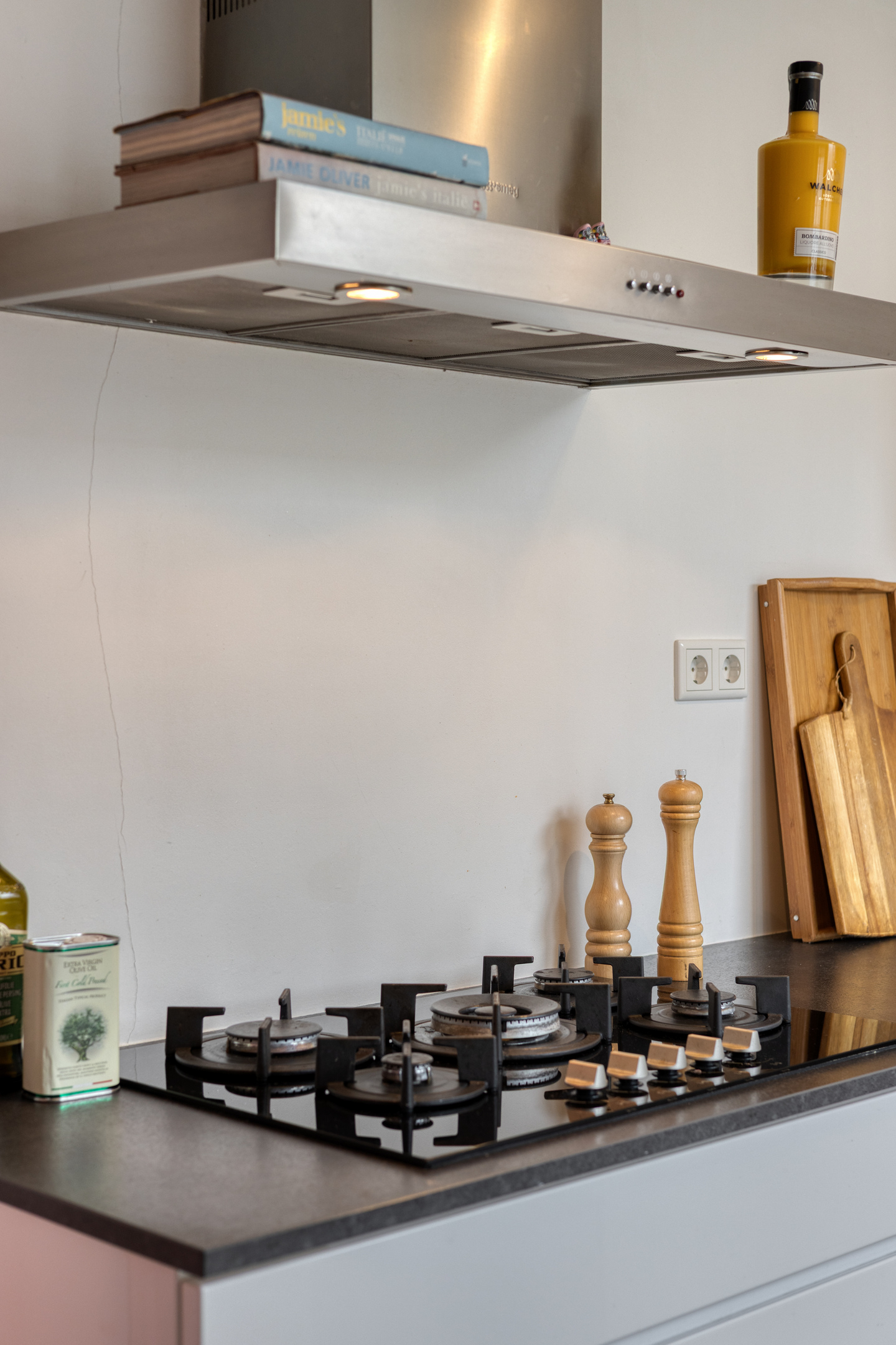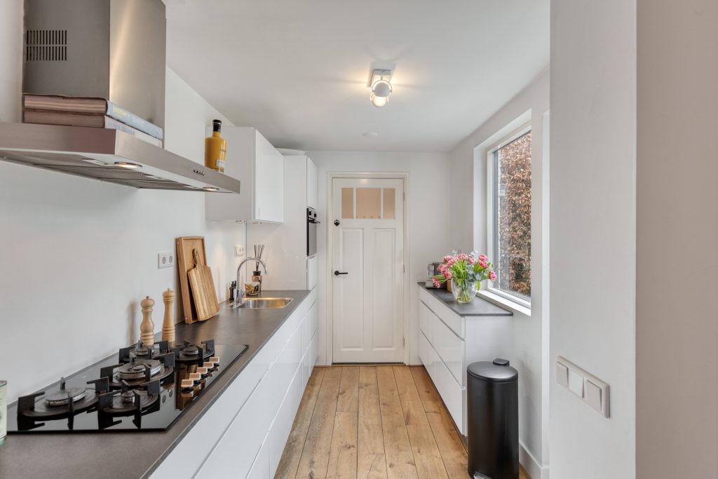 Open keuken met een modern keukenmeubel aan 2 wanden. De keuken is uitgerust met een 5-pits gaskookplaat, RVS afzuigkap, vaatwasser, koelkast, combioven en spoelbak. Middels een loopdeur toegang tot de achtertuin.
