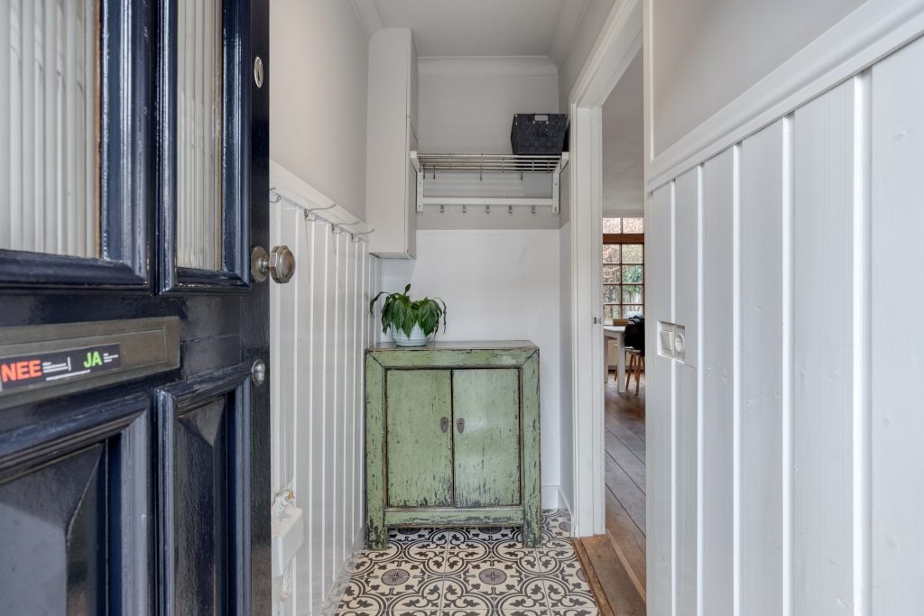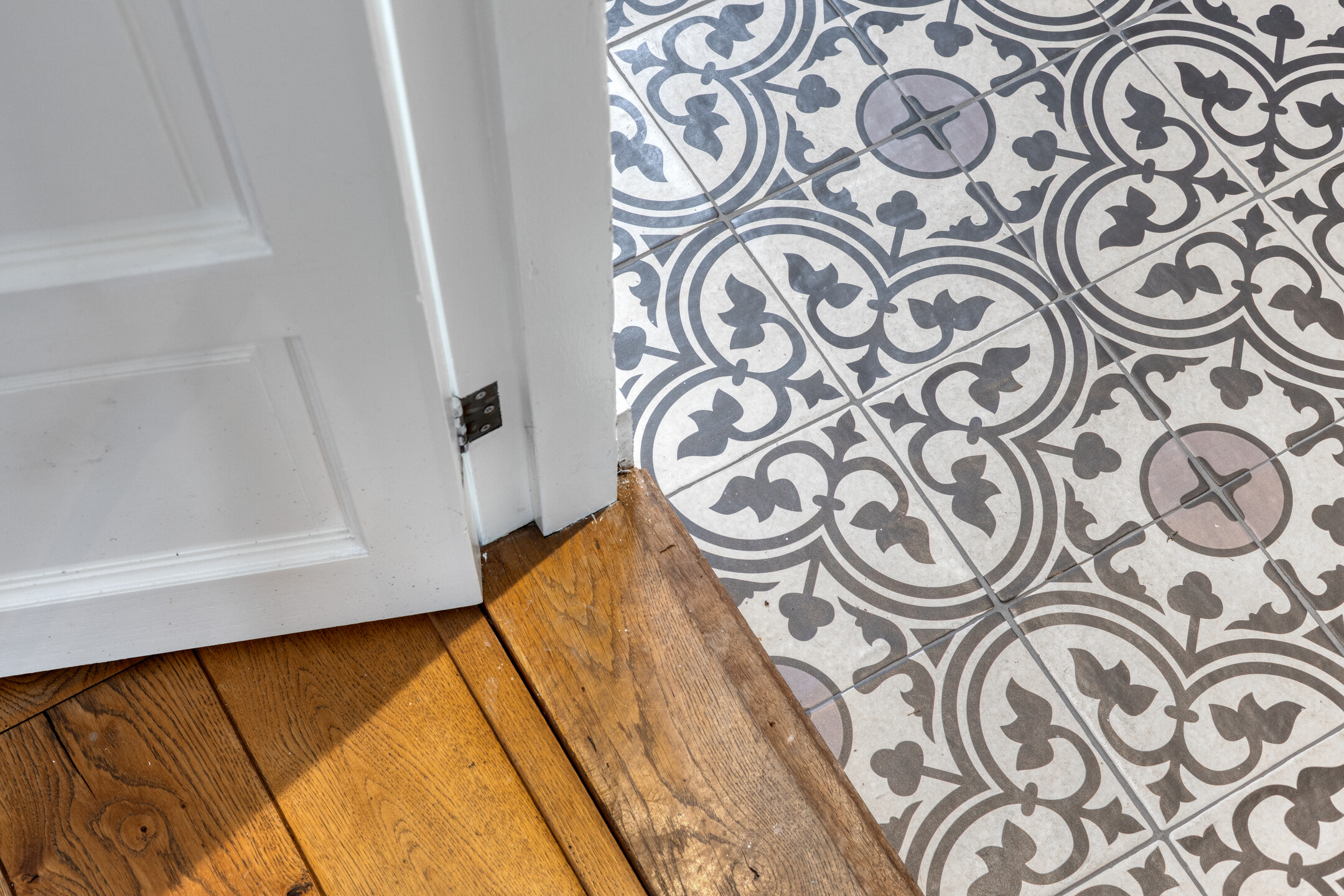 Entree/hal met Portugese tegelvloer, meterkast en toegang tot de woonkamer.