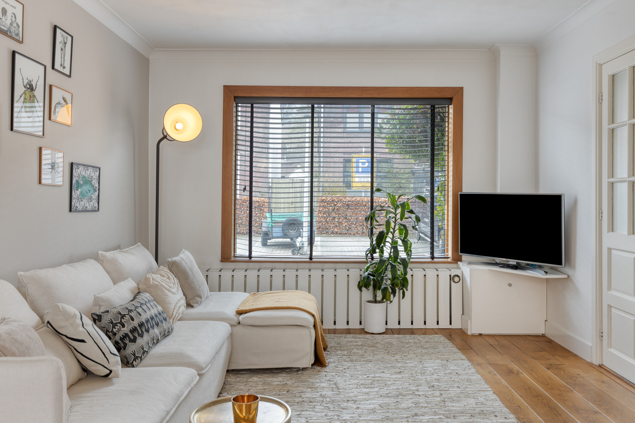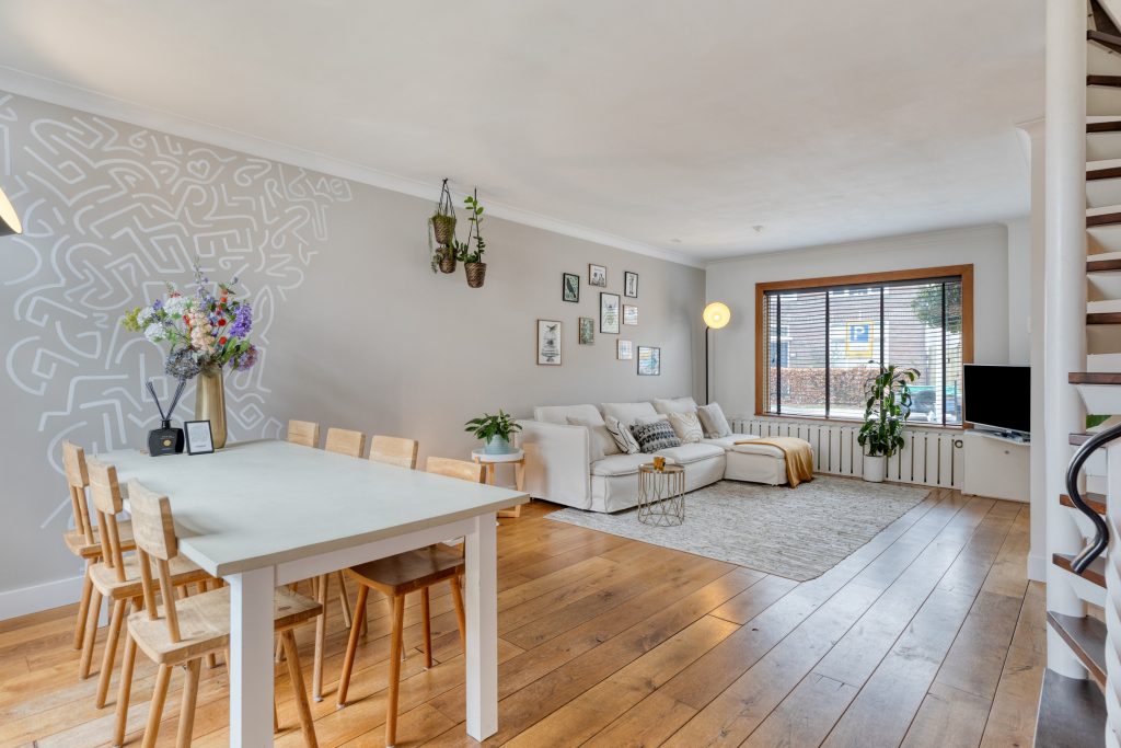 Sfeervolle lichte woonkamer met een massief eikenhouten vloer en open trapopgang naar de 1ste verdieping. De woonkamer is onderverdeeld in een eetgedeelte aan de voorzijde en een zitgedeelte aan de achterzijde met zicht op de tuin.