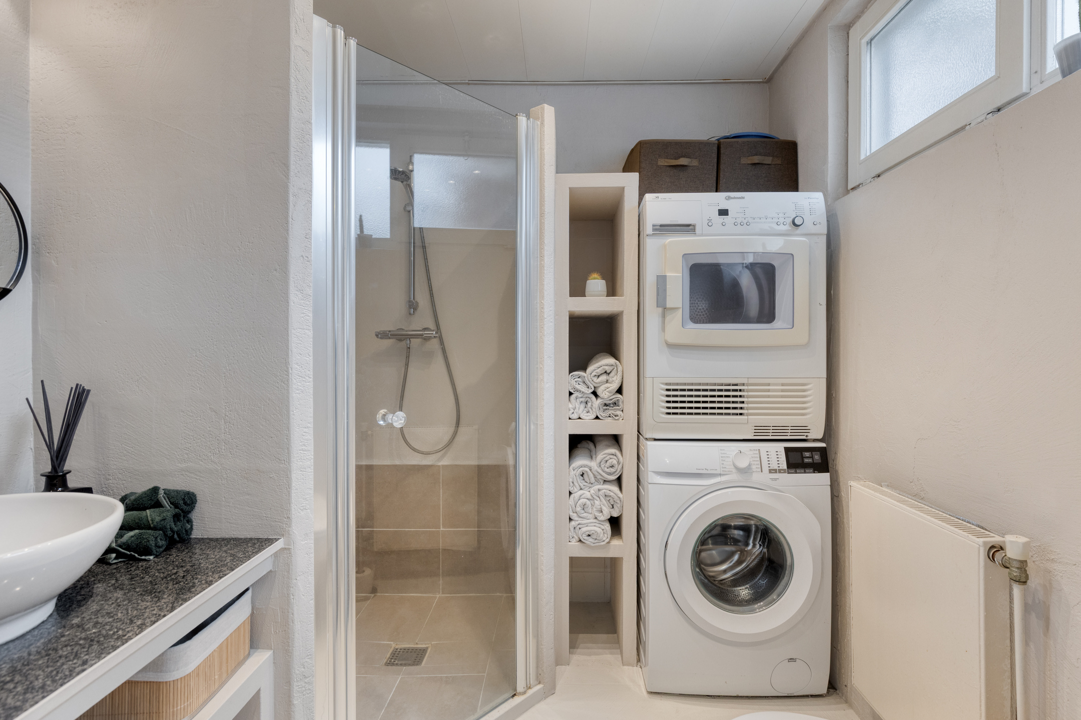 Fully tiled, modern, bright bathroom with a walk-in shower, fixed washbasin, vanity unit, wall-hung toilet, and connections for a washing machine and dryer.