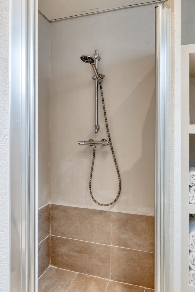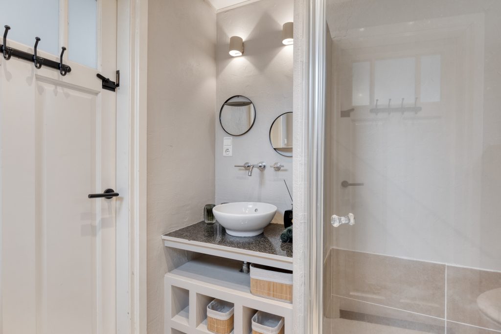 Geheel betegelde moderne lichte badkamer met een inloopdouche, vaste wastafel, badkamer meubel, zwevend toilet en de aansluitingen voor de wasmachine en droger.