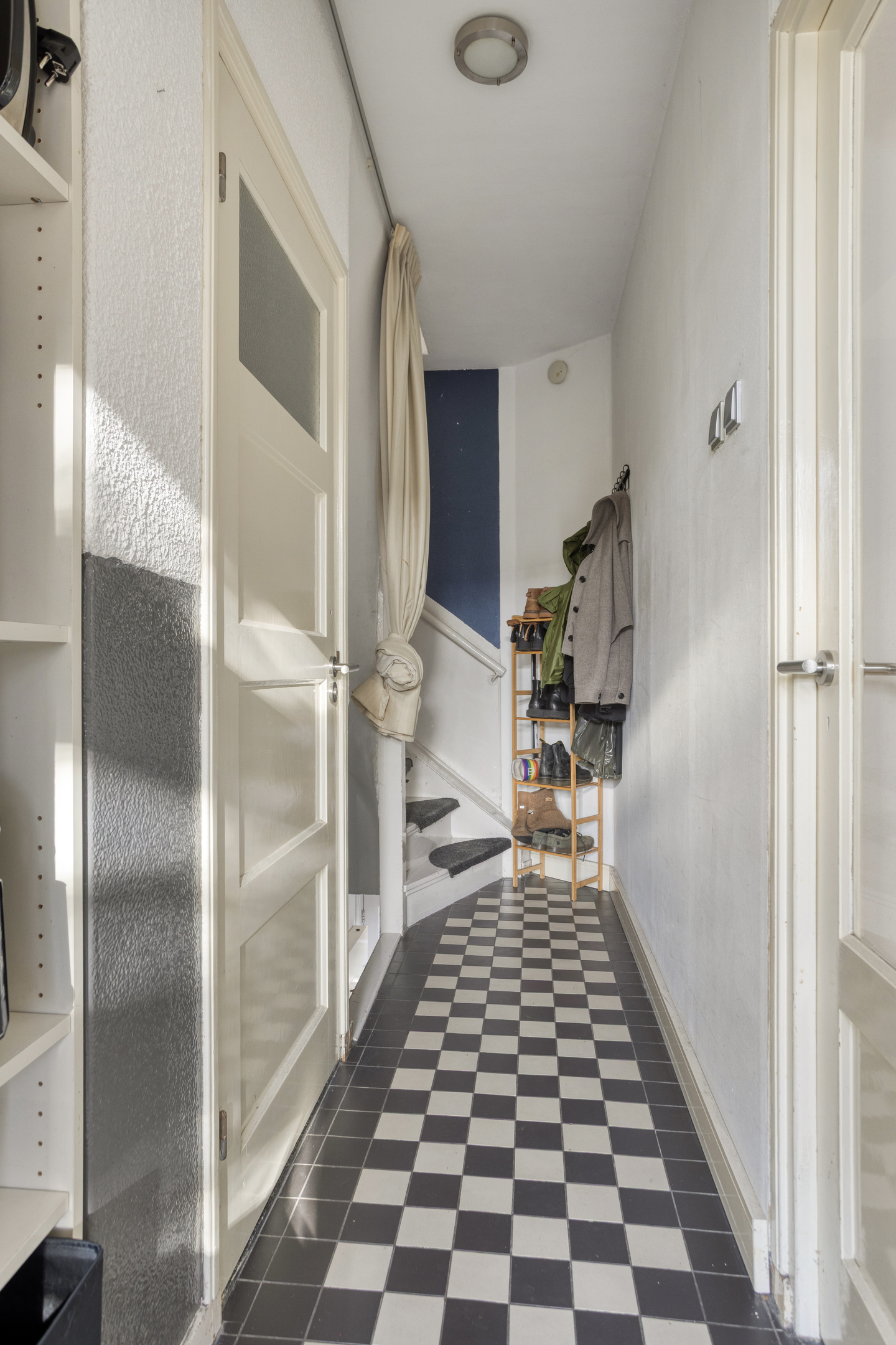 Entree. Hal met meterkast en trapopgang. Aan de achterzijde is via een pad de eigen berging bereikbaar.