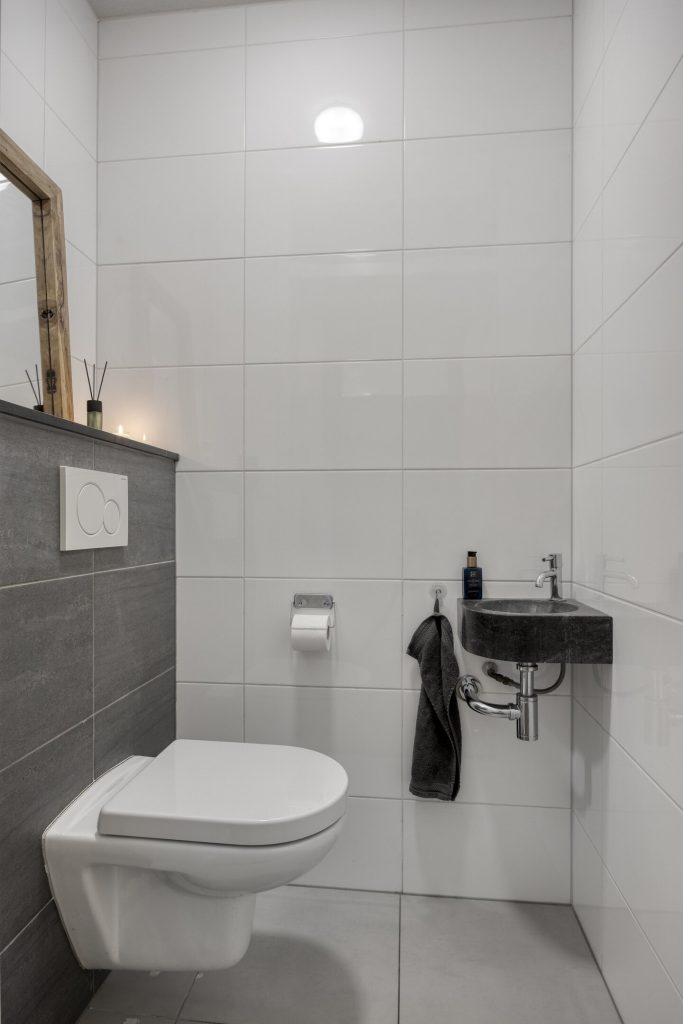 Aparte toiletruimte, geheel betegeld, met zwevend closet en fonteintje.