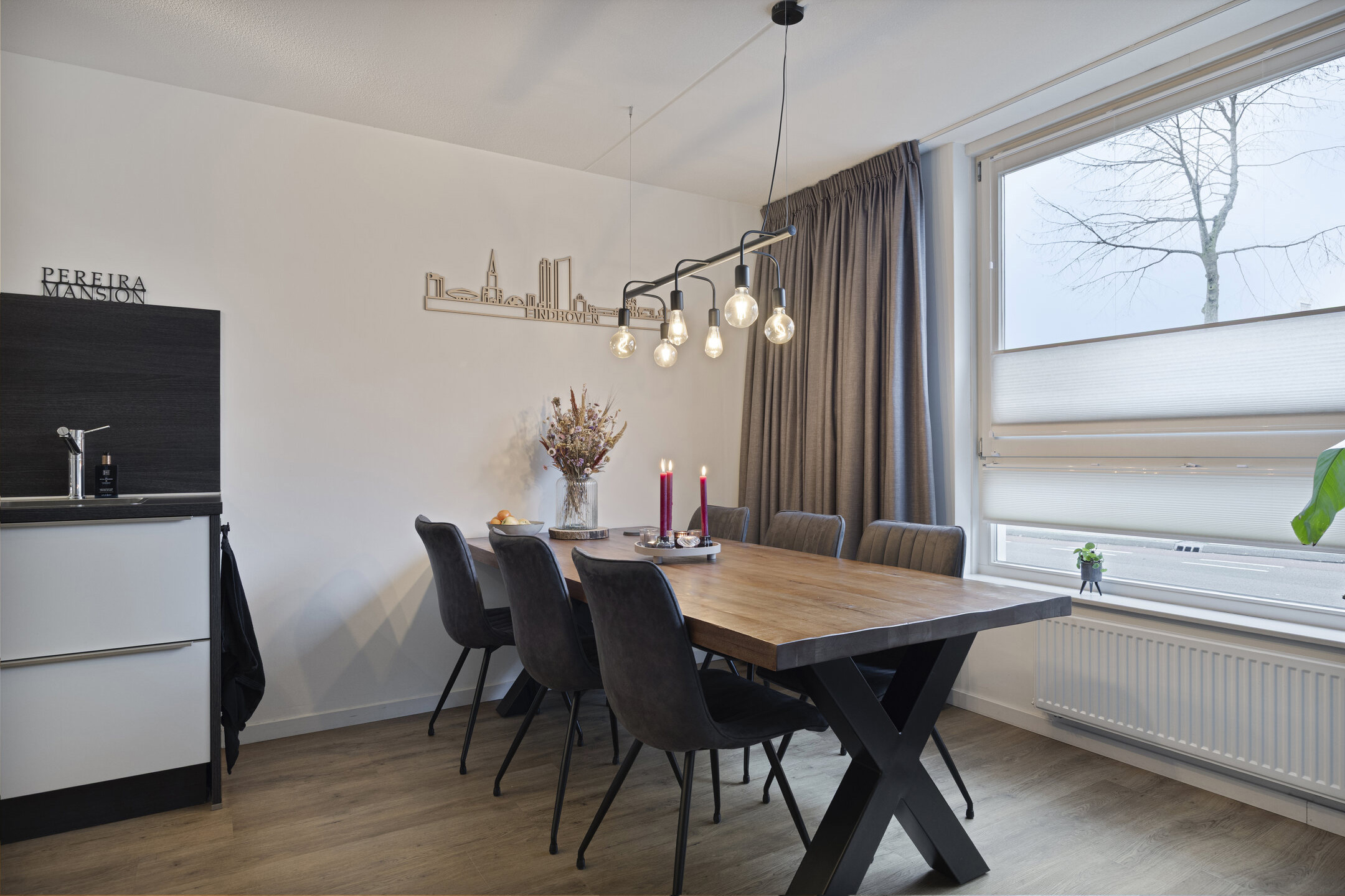 Aan de voorzijde van het appartement bevindt zich het eetkamergedeelte met open keuken, optimaal lichtinval middels tweetal grote raampartijen, fraai en prettig uitzicht richting monumentale stadsvilla.