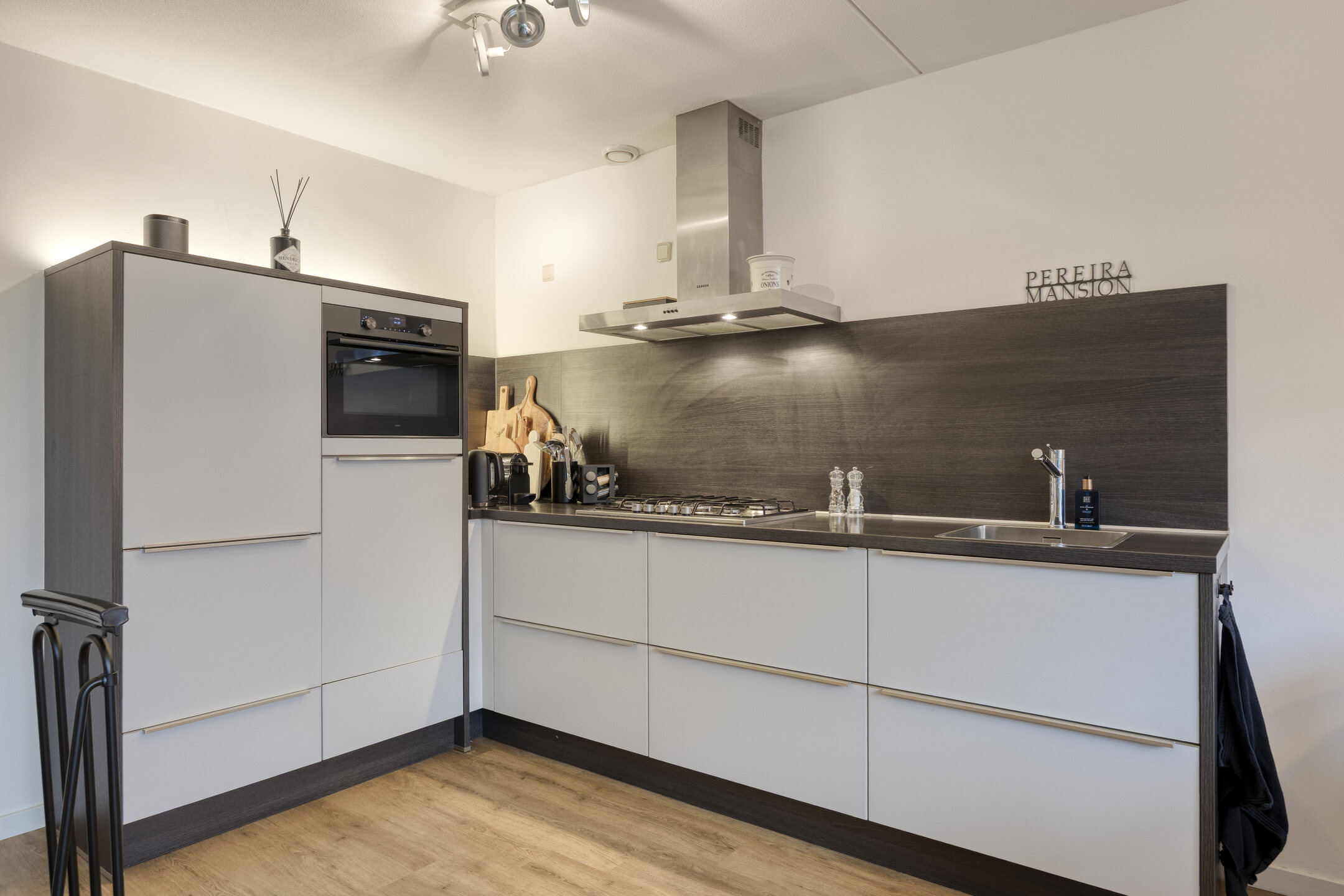 Open keuken, voorzien van kunststof aanrechtblad met spoelbak, volop boven- en onderkasten in lichte kleurstelling, 5-pits gaskookplateau, afzuigkap, combi-oven/magnetron, vaatwasser op hoogte en koelkast.