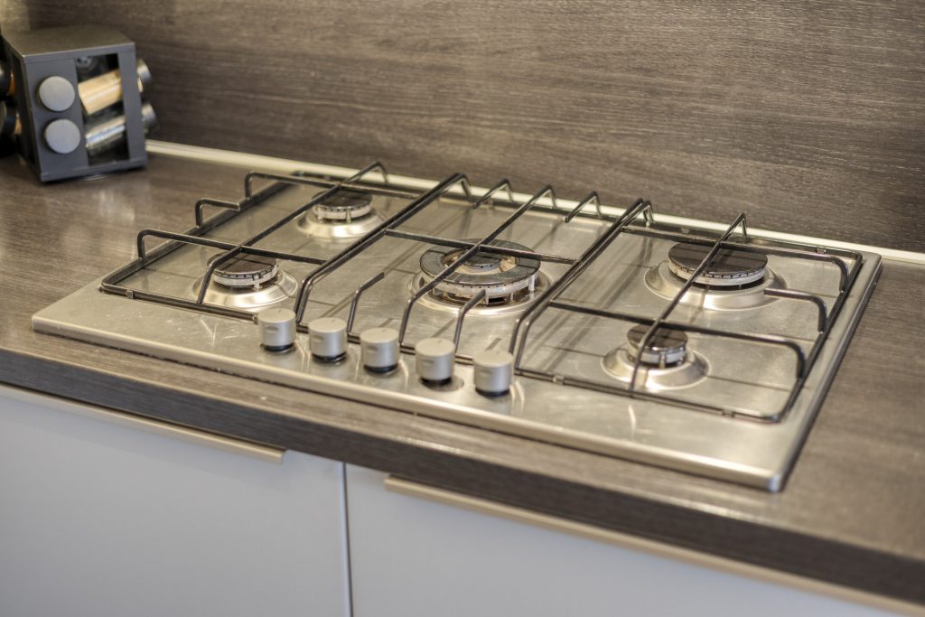 Open-plan kitchen, equipped with a synthetic countertop and sink, plenty of upper and lower cabinets in light colors, a 5-burner gas cooktop, extractor hood, combination oven/microwave, height-adjustable dishwasher, and refrigerator.
