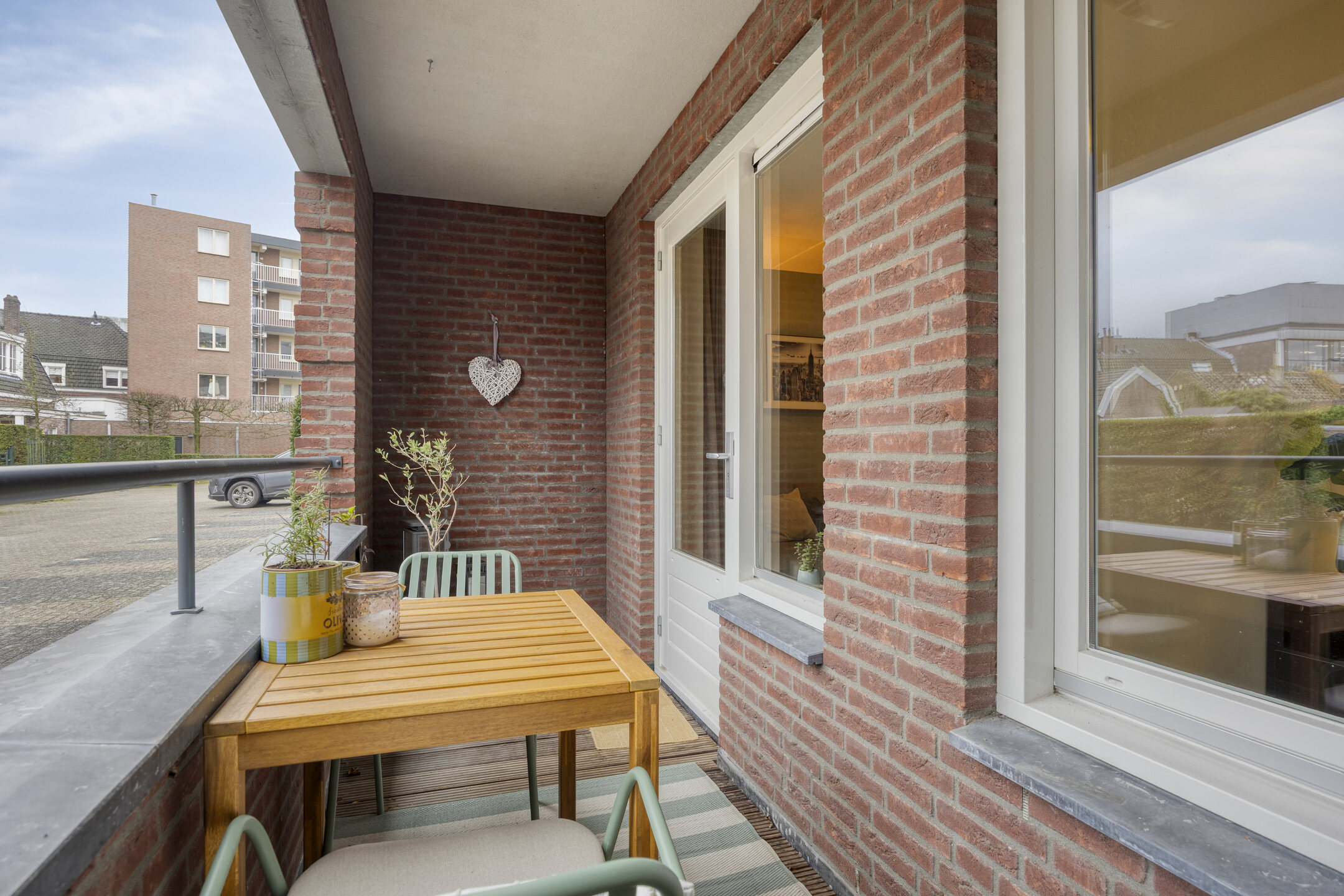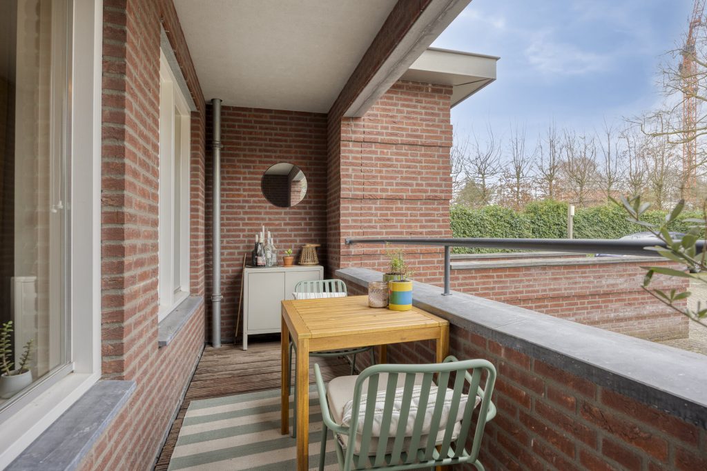 Balkon, overdekt, als verlengstuk van de woonkamer, op het zuidoosten gelegen, rustig gelegen aan de achterzijde van het complex, met uitzicht richting Methusalemplein.