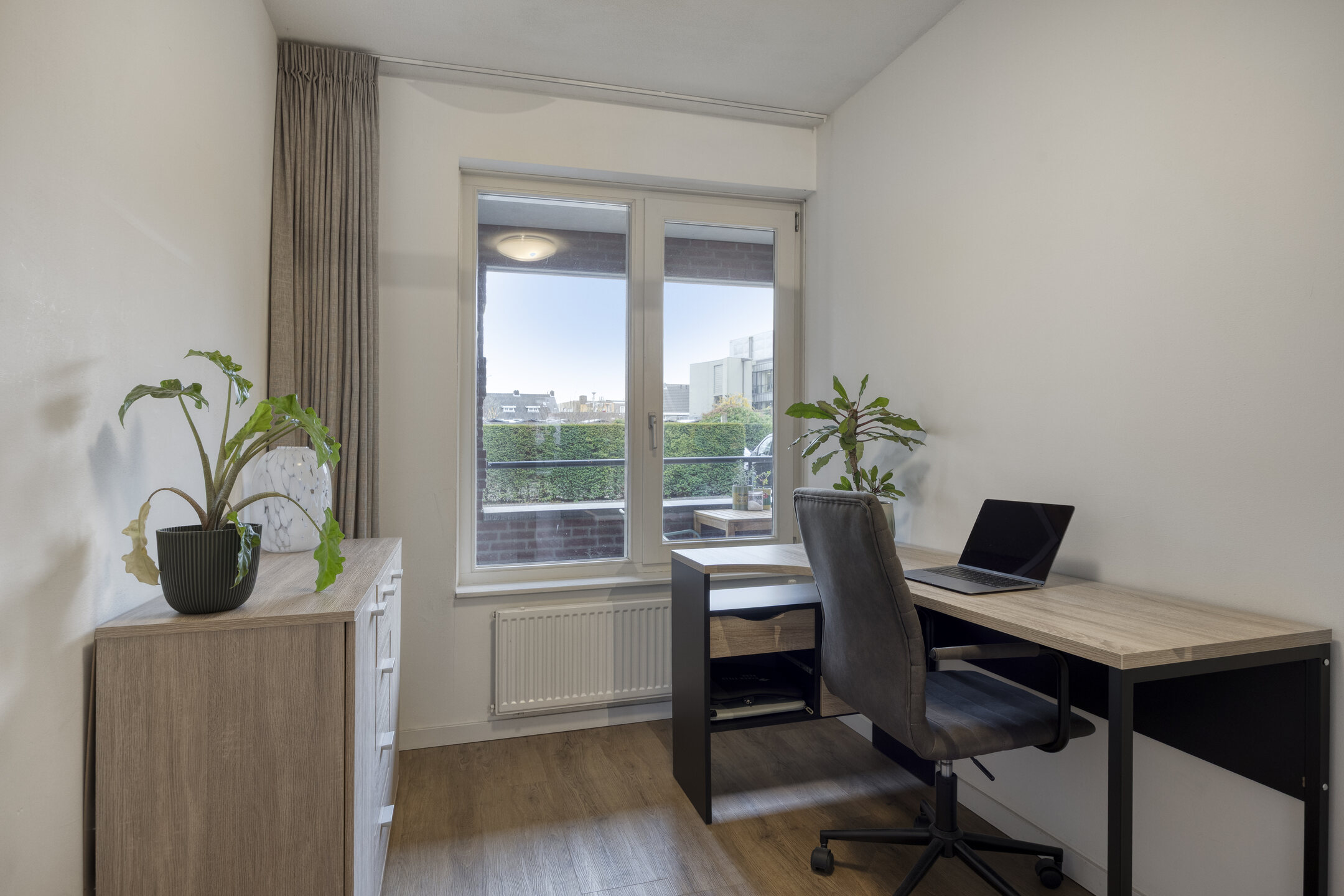 Slaapkamer 2, nu in gebruik als werkkamer, aan de achterzijde gelegen, uitgevoerd met PVC-vloer.