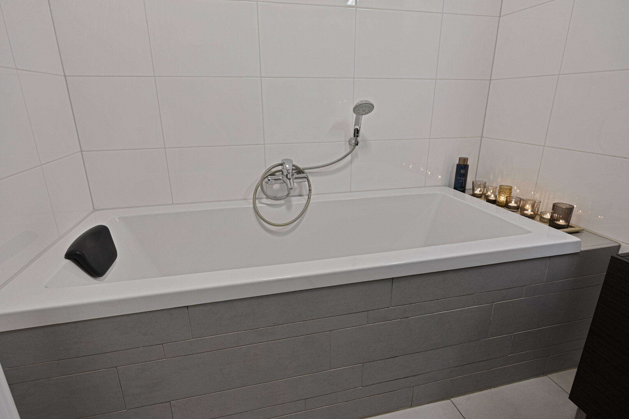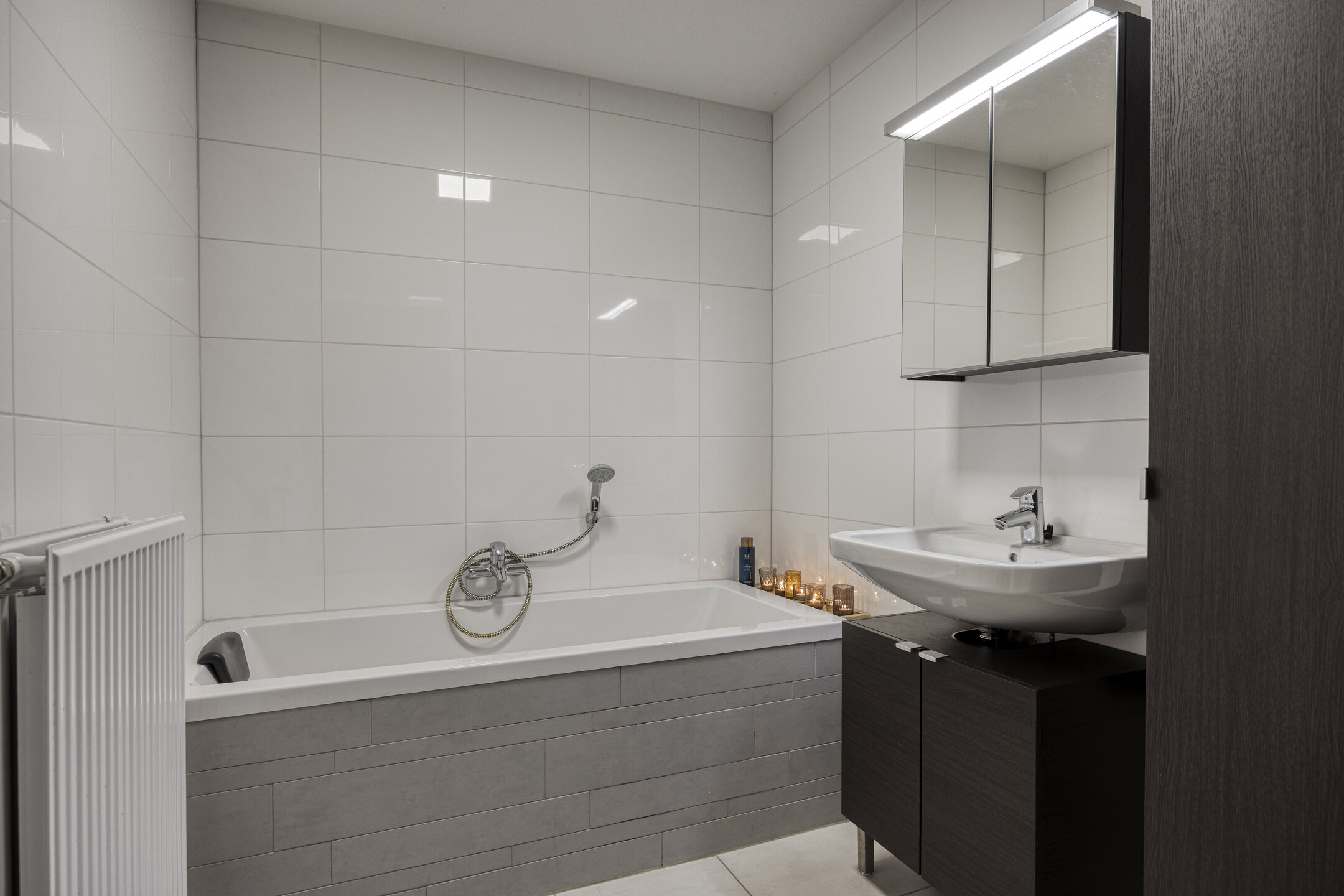 Badkamer, geheel betegeld, voorzien van wastafel in meubel, douche, ligbad en wandmeubel.