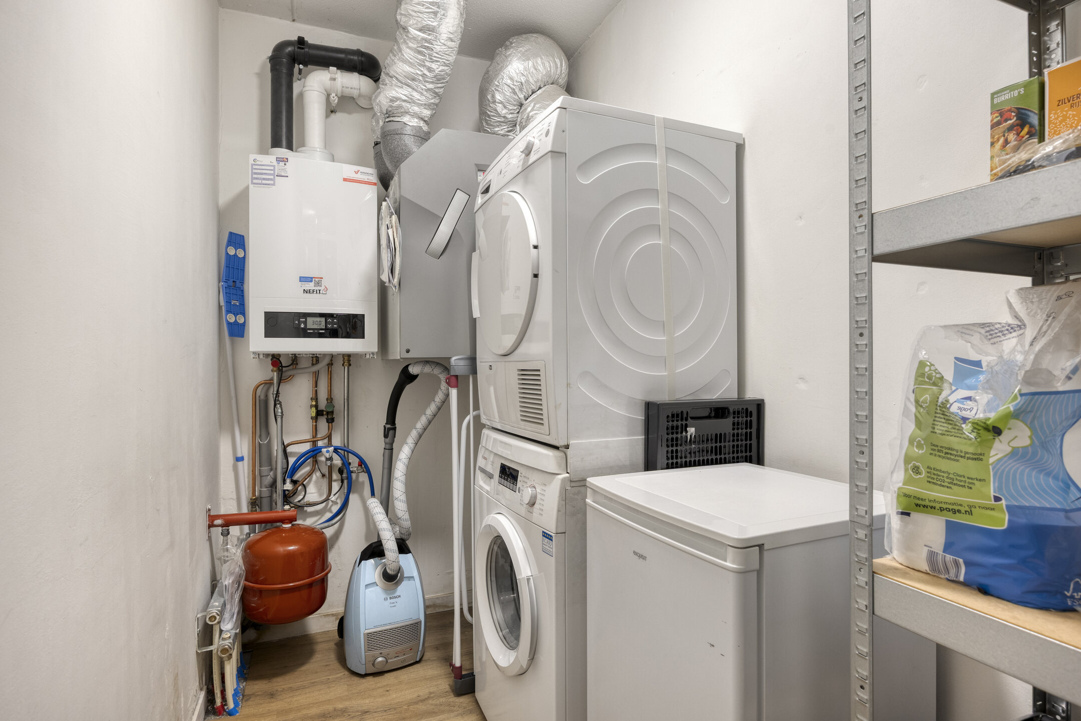 Was-/bergkamer, met aansluiting wasmachine en wasdroger, aansluiting mechanische ventilatie-unit, opstellingsruimte CV-combi ketel Nefit Trendline.
