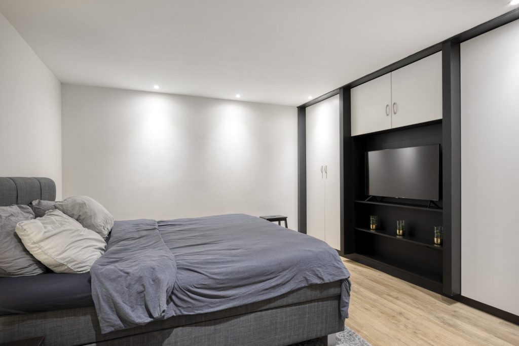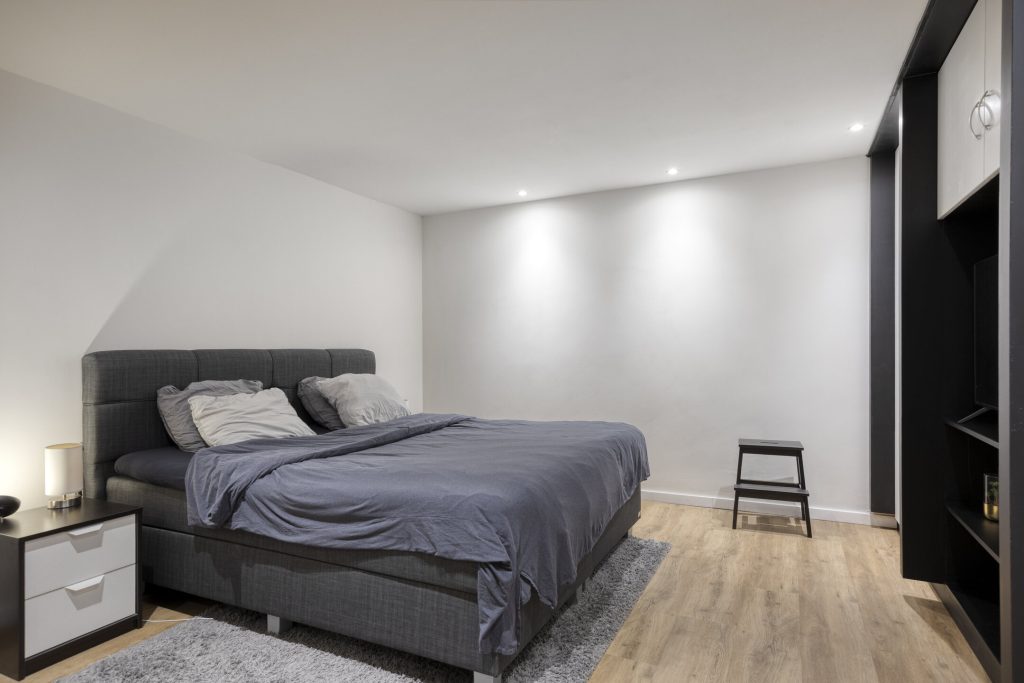 Hier bevindt zich de grote slaapkamer voorzien van een PVC-vloer, ingebouwde kasten en inbouwspots in het plafond.