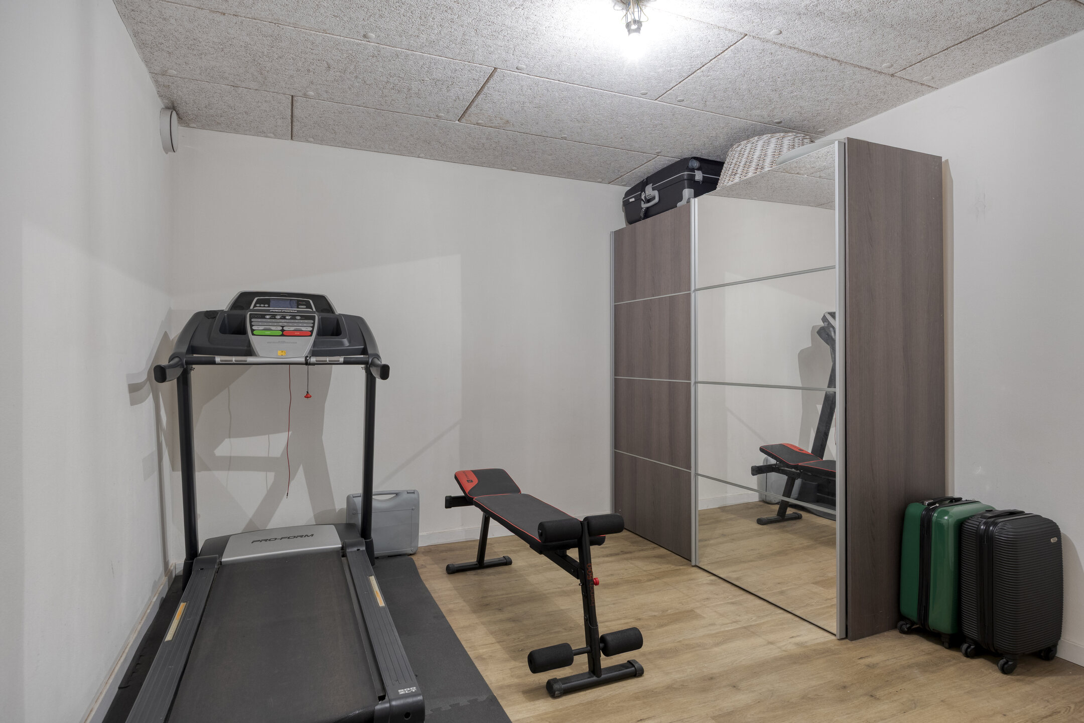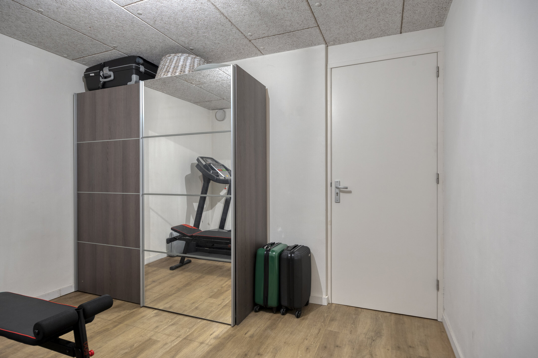 Vanuit de slaapkamer is er een deur naar de berging. Deze ruimte is voorzien van een PVC-vloer en is nu in gebruik als sportruimte.