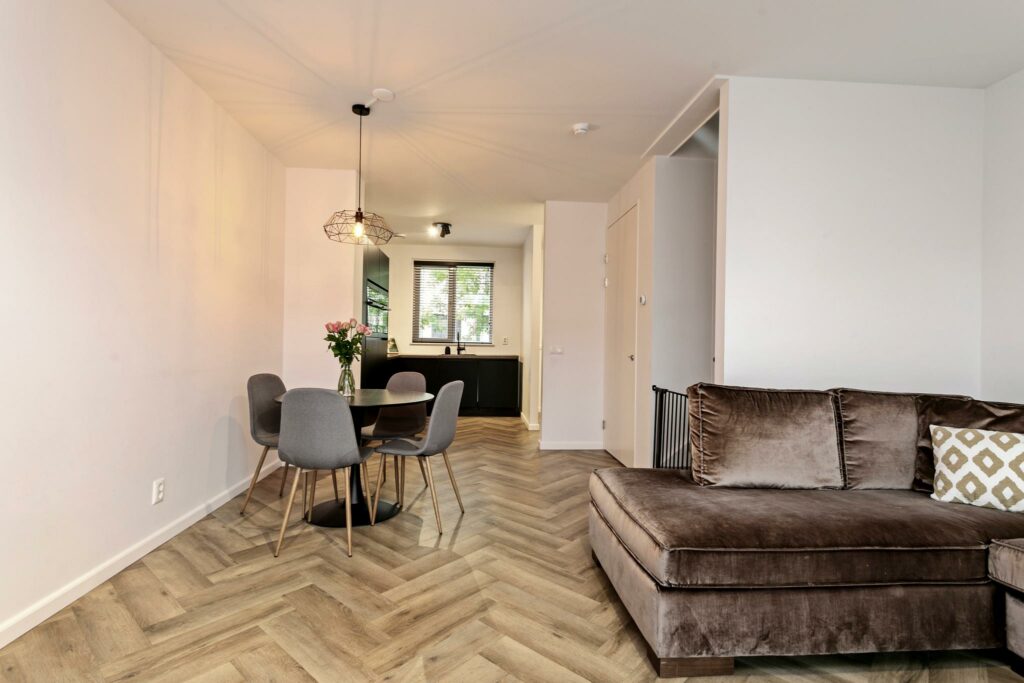 Je voelt je direct thuis zodra je de tuingerichte woonkamer binnenkomt. Wat een sfeervolle ruimte! De woonkamer is voorzien van veel lichtinval, dankzij de grote ramen en openslaande deuren naar de achtertuin. Alle raampartijen zijn voorzien van kunststof kozijnen met dubbele beglazing. De woonkamer is afgewerkt met een fraaie PVC-vloer en glad gestucte wanden. Verder heb je beschikking over een handige trapkast. De gehele woning is voorzien van vloerverwarming, die niet alleen verwarmt, maar ook koelt.
