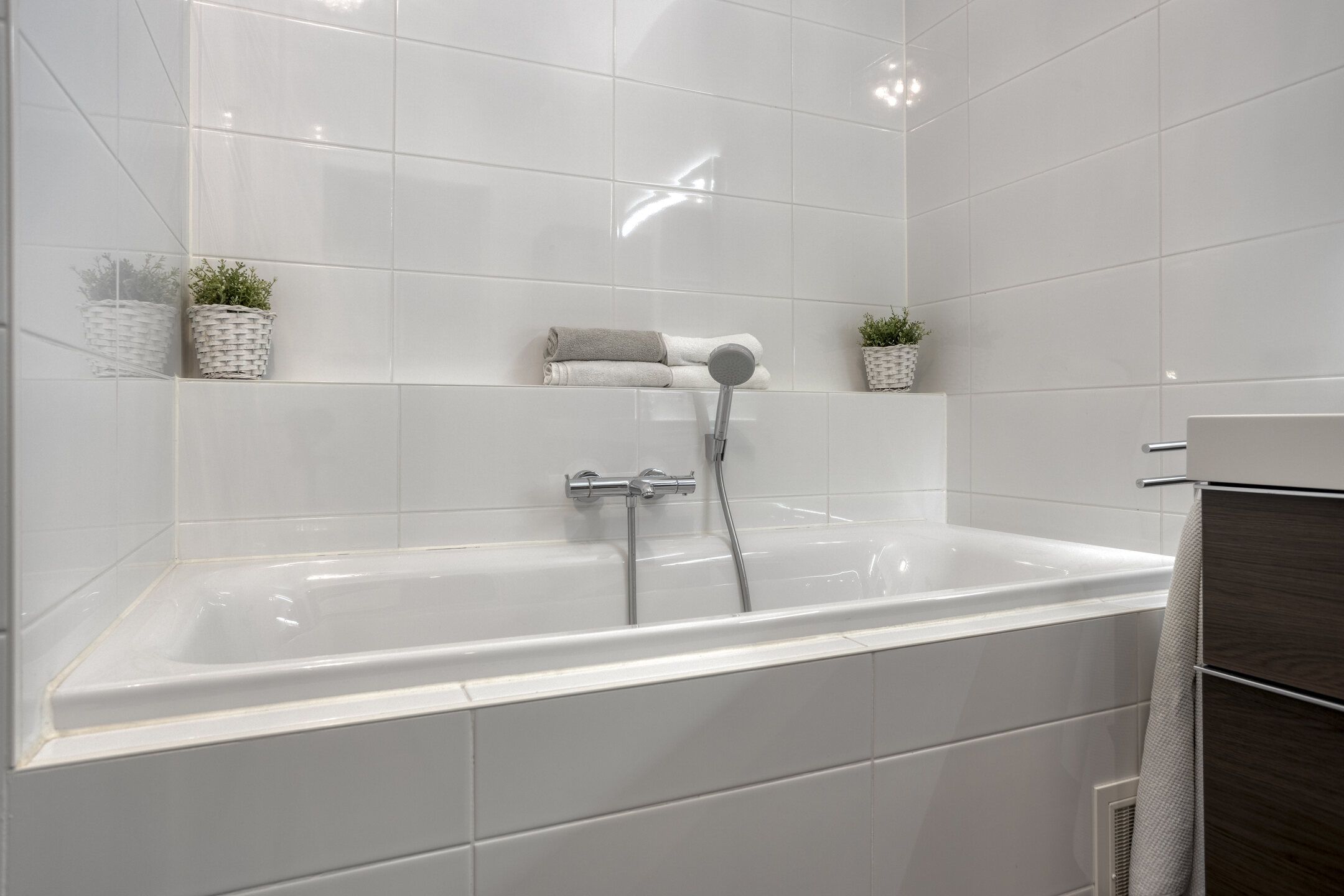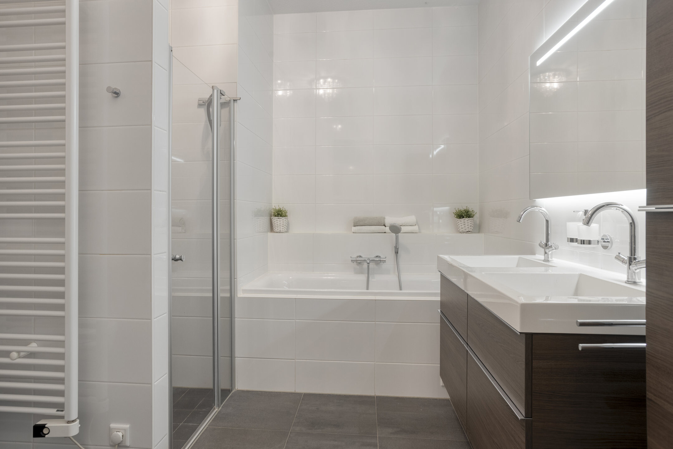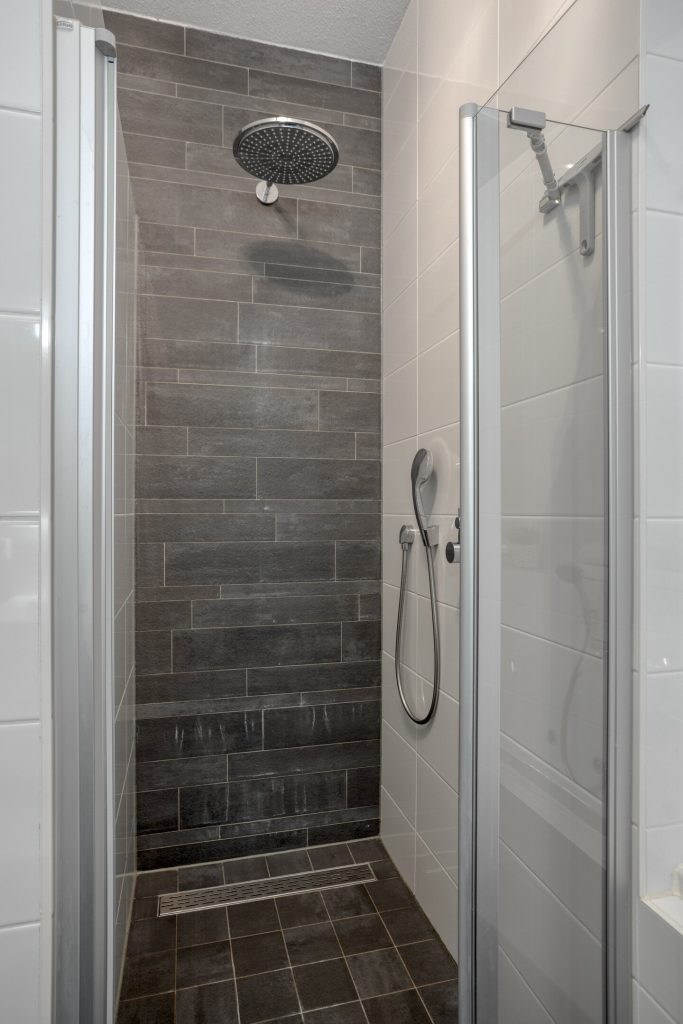 Upon entering, the bathtub (bubblebath) is immediately noticeable. A combination of dark and light tiles has been chosen. The bathroom features a generously sized vanity unit on the wall, equipped with two faucets and practical drawers. A very spacious walk-in shower has been created with both a rain shower and a hand shower. Mechanical ventilation also provides excellent ventilation. Various recessed spotlights, a heated mirror, and underfloor heating complete this bathroom.