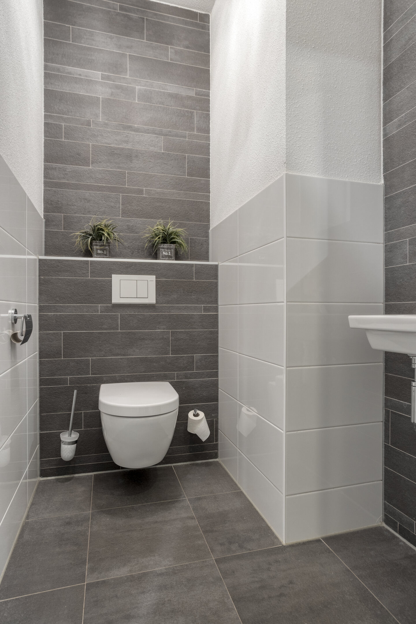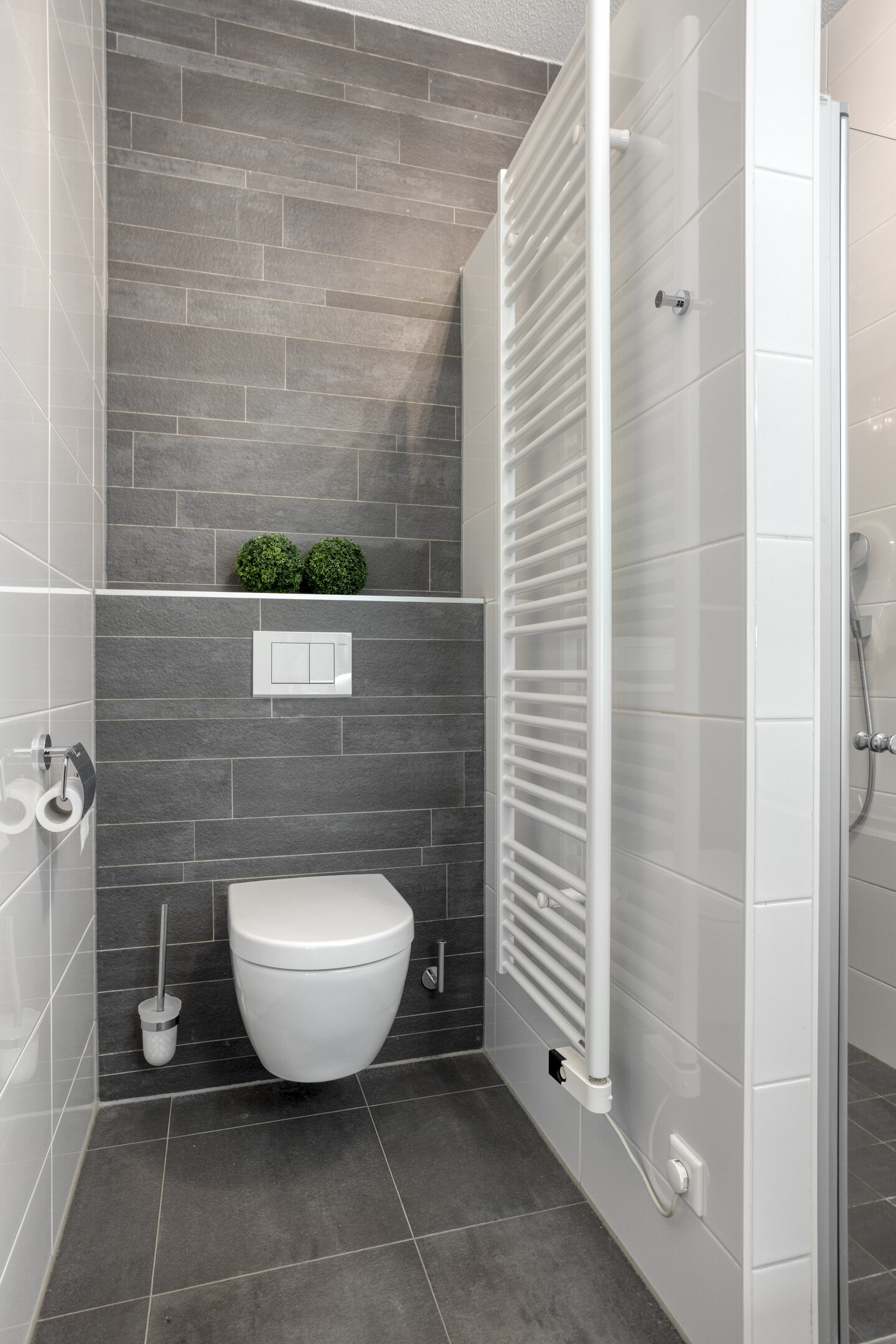 From the hall, you have access to the toilet and the utility room. The modern toilet is partially tiled and pleasantly fresh. It features a wall-hung toilet with a beautiful, matching hand basin. The utility room is fully tiled and offers ample storage space. There’s room for an extra refrigerator or freezer. The laundry connections are located in this practical space. The central heating boiler and underfloor heating unit are also located here. It’s an ideal space for neatly storing your laundry, supplies, and extra items.