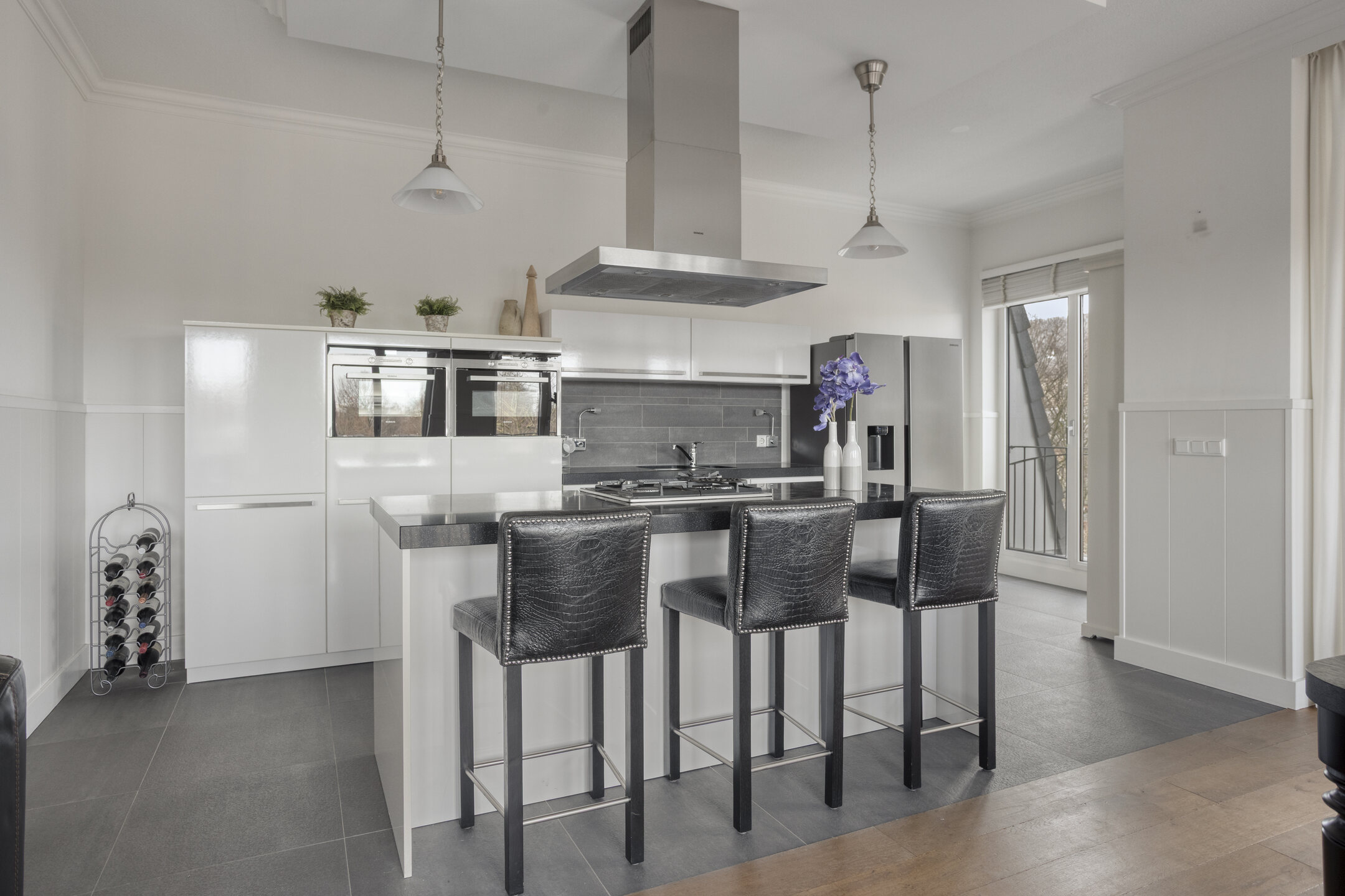 The open-plan kitchen with a wall-mounted design is equipped with luxury built-in appliances. Thanks to various built-in appliances such as an gas-cooktop, dishwasher, refrigerator, combination steam oven, and combination microwave, this kitchen is fully equipped with every convenience. The beautiful kitchen island with a lovely composite worktop features an induction cooktop and a stylish stainless steel extractor hood. Various upper and lower cabinets provide ample storage space for all your kitchen utensils!